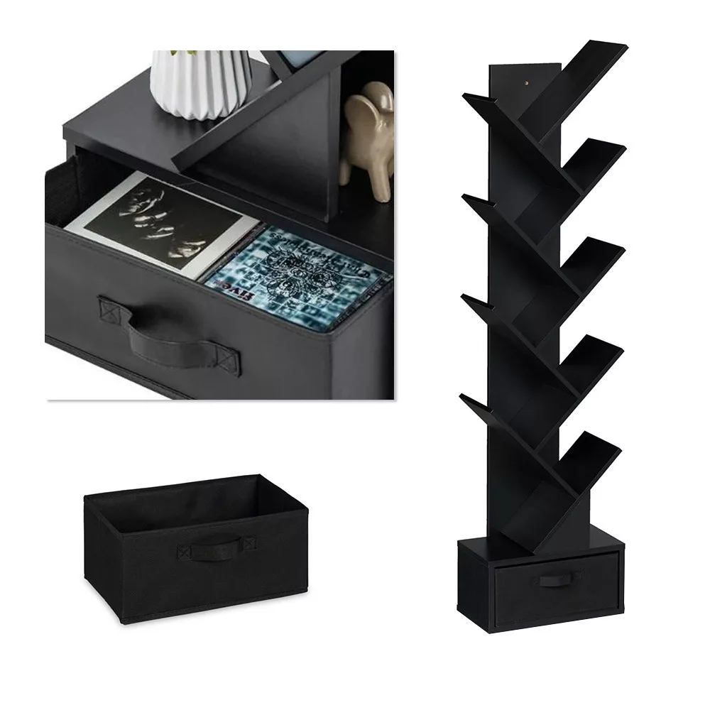 Półka na książki posiada łącznie 10 otwartych przegród, idealnych do przechowywania książek, roślin lub dekoracji. Tekstylna szuflada znajdująca się na dole pozwala na dyskretne przechowywanie – ale w razie potrzeby można ją usunąć, aby uzyskać dodatkową przestrzeń na otwartych półkach.