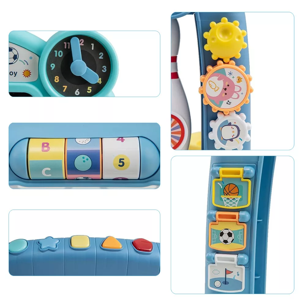 Obrotowe zębatki, podnoszone karty, zegar i różne kształty stwarzają możliwości nauki o liczbach, literach i wzorach, rozwijając umiejętności myślenia i koordynację ręka-oko.
