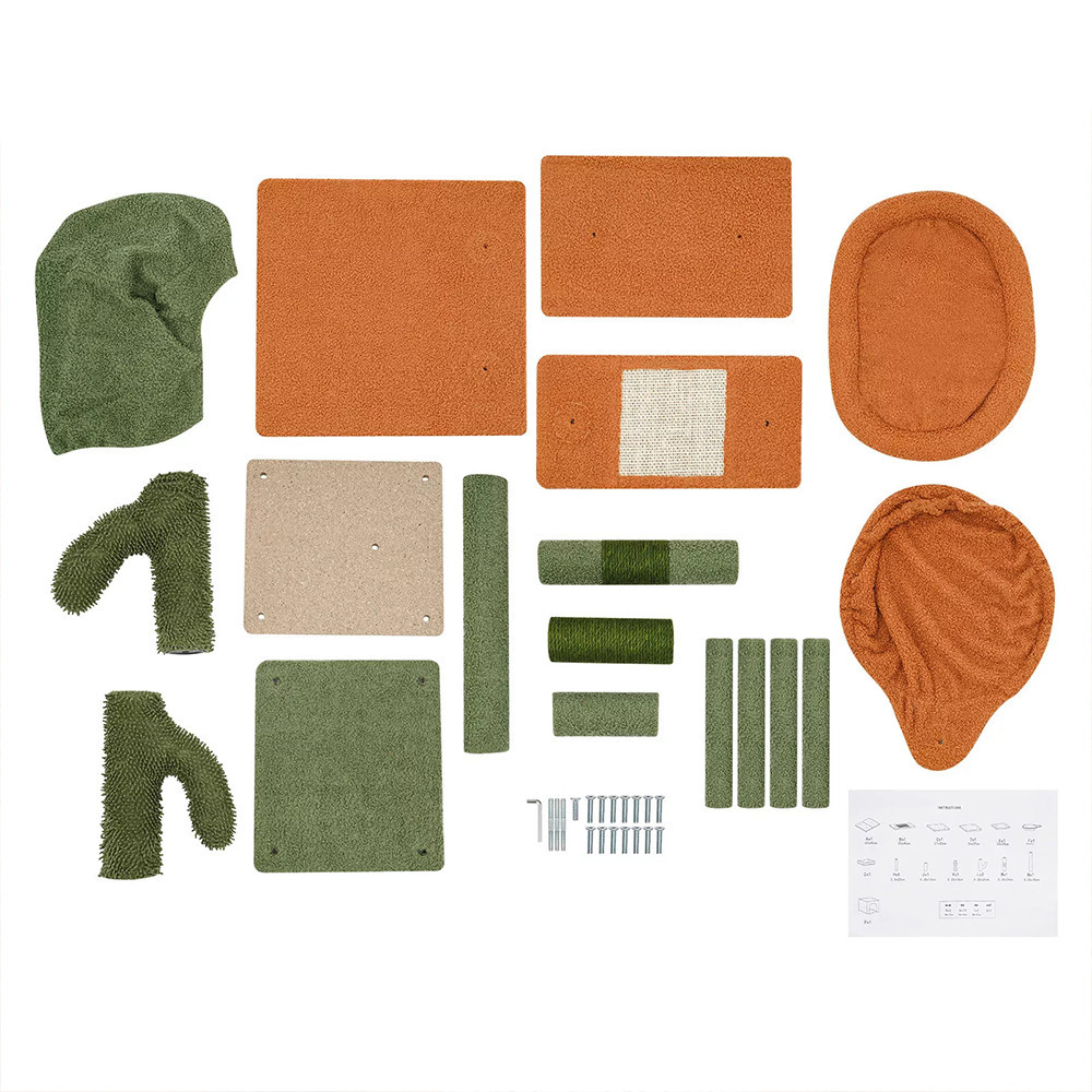 Drapak oferuje miejsca do odpoczynku na różnych poziomach: przestronną kryjówkę, wygodny hamak oraz górną platformę widokową, gdzie Twój kot może spokojnie drzemać lub obserwować otoczenie. Pokrycie słupków liną do drapania pomaga chronić meble przed zadrapaniami.