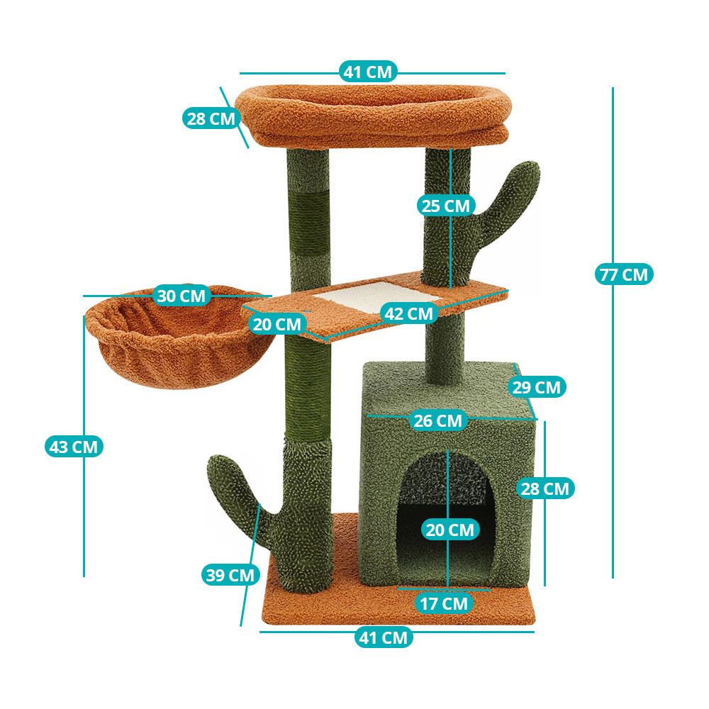 Forma kaktusa inspirowana naturą nadaje drapakowi nowoczesny i zabawny wygląd. Zielona i brązowa kolorystyka harmonijnie komponuje się z każdym wnętrzem, tworząc unikalny element dekoracyjny.