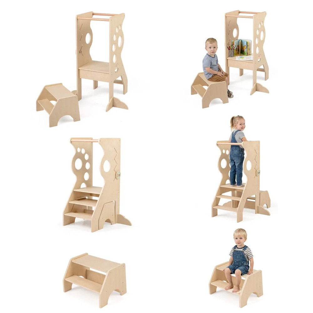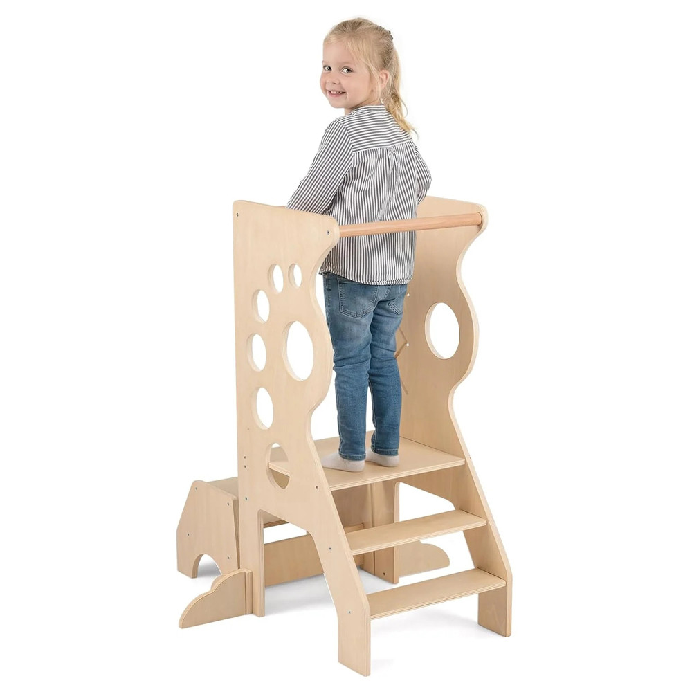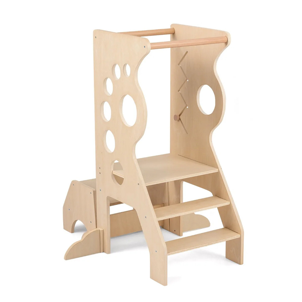 Dołączony dwustopniowy stołek można używać osobno lub razem z wieżą, kiedy jest potrzebny. Gdy potrzebujesz więcej miejsca, stołek można wsunąć, zajmując mniej przestrzeni. Wbudowana zabawka z przesuwanymi elementami zapewnia zajęcie podczas oczekiwania na kolejny krok.
