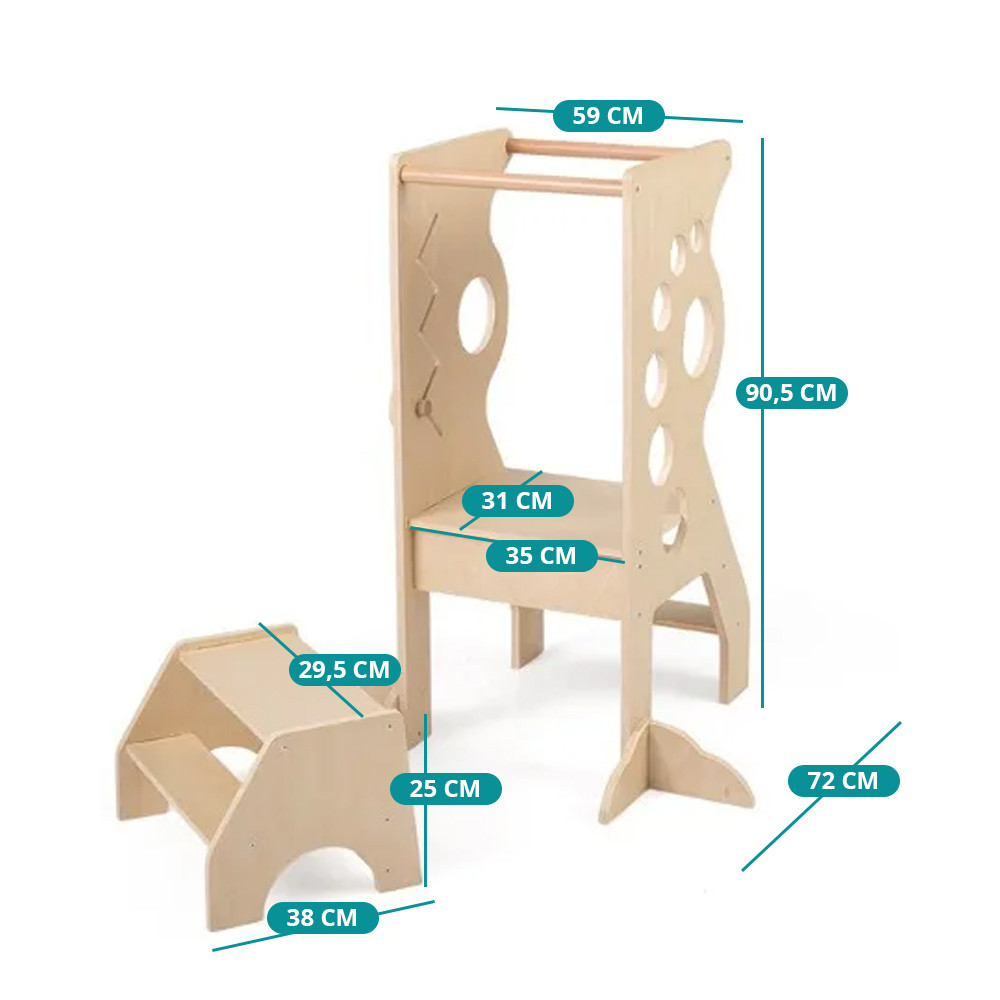 Szeroka powierzchnia podestu i solidna drewniana konstrukcja zapewniają pewniejsze uczucie podczas wchodzenia i schodzenia. Bezpieczny uchwyt sprawia, że dziecko czuje się chronione podczas stania, a zaokrąglone krawędzie zmniejszają ryzyko bolesnych uderzeń.