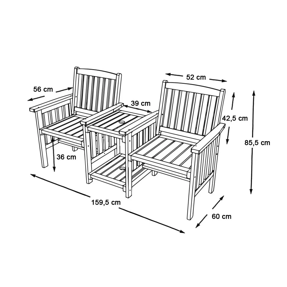 Dwumiejscowy, nierozdzielny zestaw zewnętrzny to świetne rozwiązanie, jeśli szukasz praktycznego i stylowego mebla do ogrodu lub na taras. Jest wygodny, a przy tym wprowadza przyjemny klimat na zewnątrz. Krzesła i stół są połączone w jedną całość, bez możliwości ich rozdzielenia.