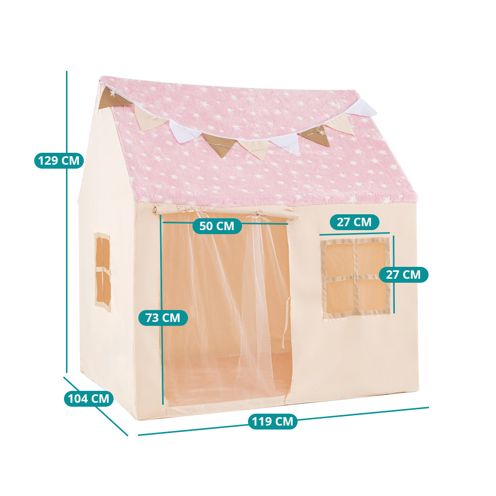 Gwiazdki na różowym dachu delikatnie świecą w ciemności, co dodaje wyjątkowego klimatu zabawie. Ciepłe białe lampki i małe flagi czynią domek przytulnym, więc wieczorne czytanie bajek lub ciche wyciszenie jest bardziej domowe.