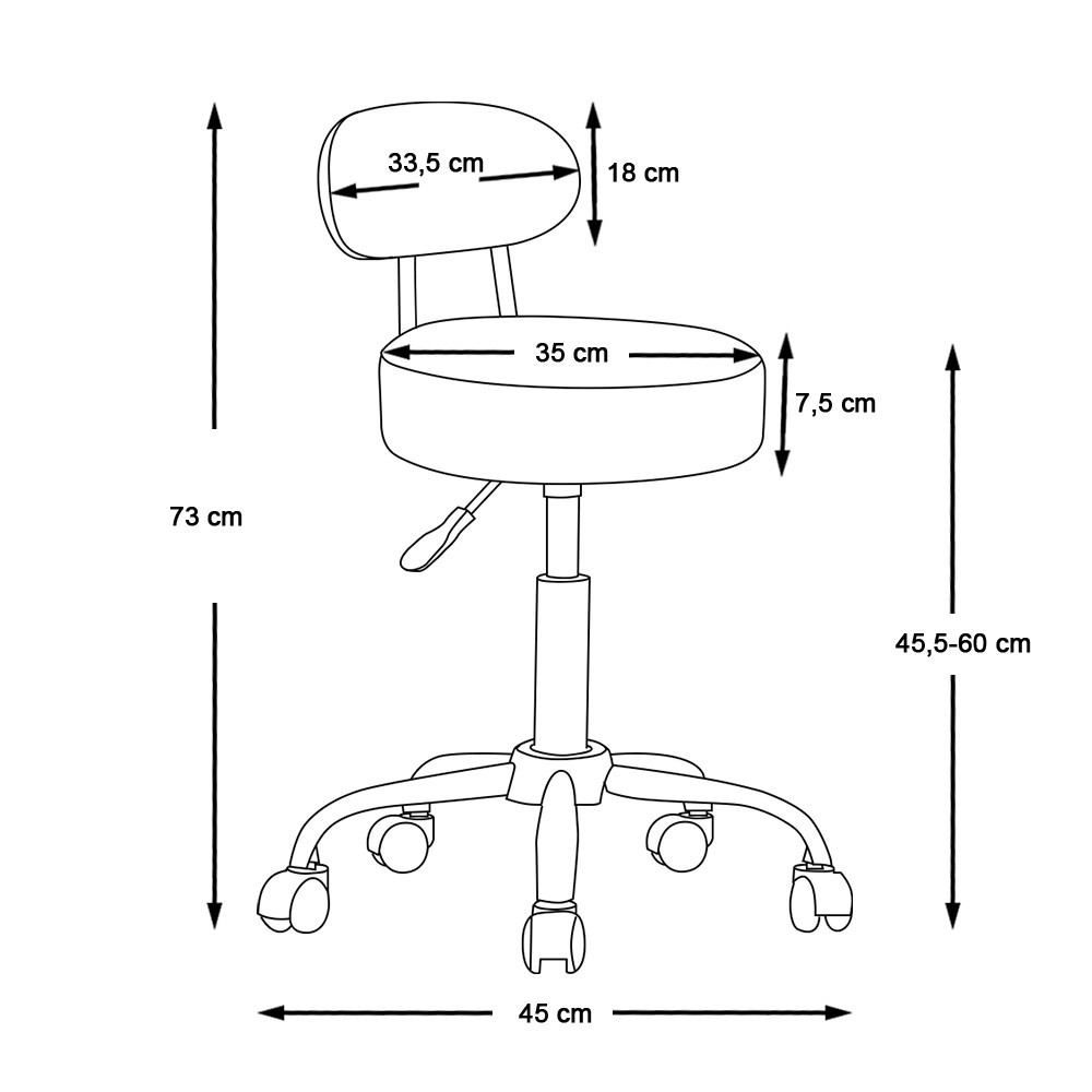 Siedzisko o średnicy 35 cm i grubości 7,5 cm zapewnia wygodę nawet przy dłuższym użytkowaniu. Oparcie o szerokości 33,5 cm i wysokości 18 cm oferuje odpowiednie podparcie pleców, zmniejszając ryzyko bólu. Regulowana wysokość siedziska (45,5–60 cm) pozwala na dostosowanie krzesła do różnych warunków pracy i wzrostu użytkownika, co zwiększa komfort użytkowania.