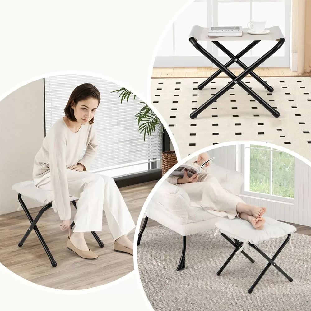 Składany podnóżek, który dołączony jest do fotela, zapewnia dodatkowy komfort, ale może być również używany jako stolik kawowy lub dodatkowe miejsce do siedzenia. Jego składana konstrukcja w kształcie X oszczędza miejsce, a poduszka może być zabezpieczona mocnymi paskami.
