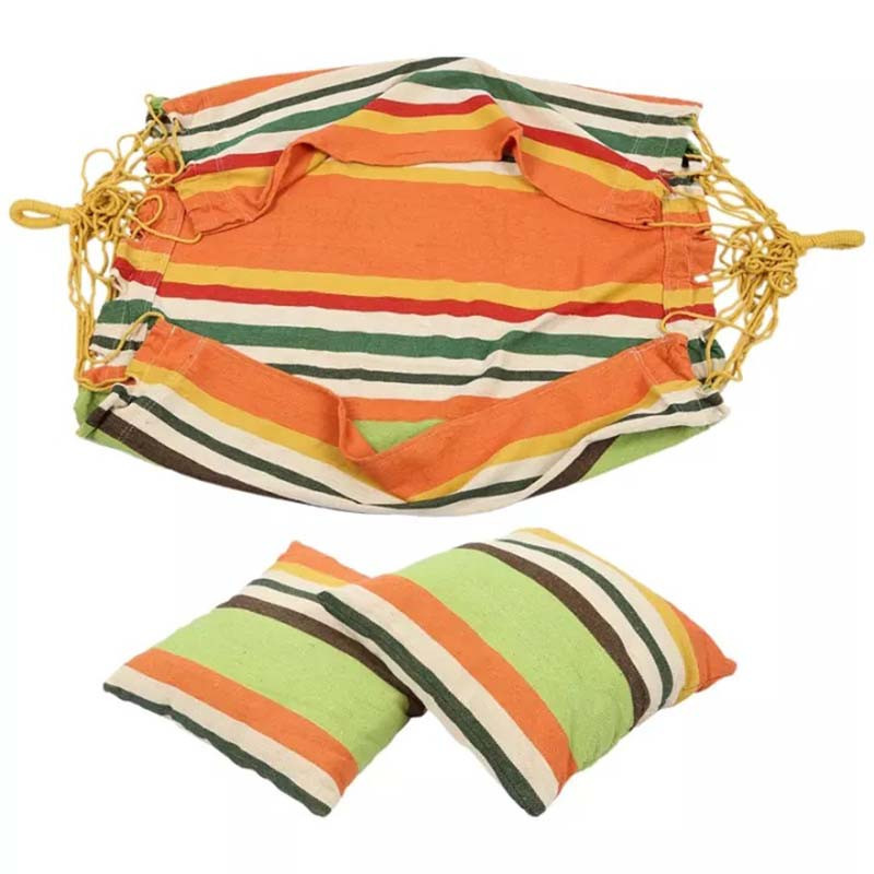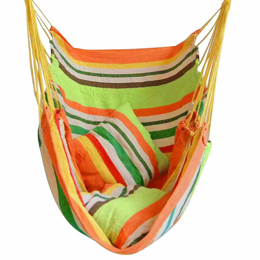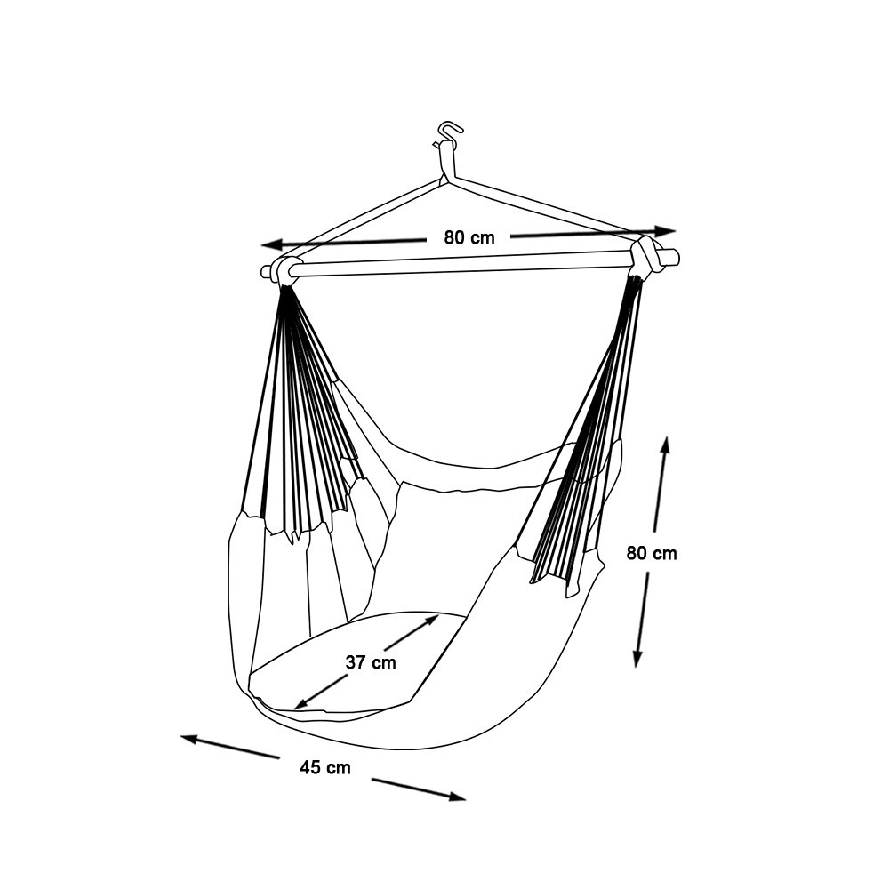 Siedzisko i oparcie są wyściełane, co zapewnia komfort nawet przez dłuższy czas. Solidny drążek górny zapewnia stabilność, a mocne płótno i liny umożliwiają udźwig do 120 kg.