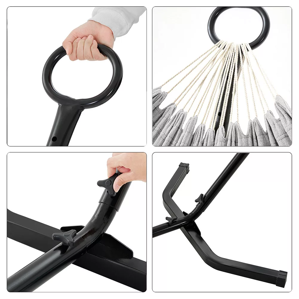 Solidny metalowy stojak ma szerokie podstawy, które zapobiegają przewracaniu się. Dzięki temu możesz cieszyć się czasem relaksu, nie martwiąc się o równowagę.