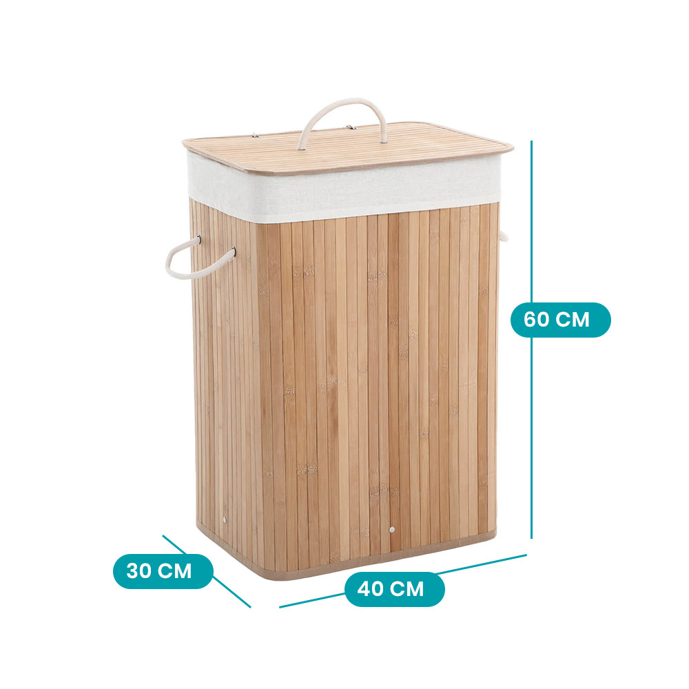 Ten bambusowy kosz na pranie o pojemności 72 litrów to idealny wybór do mniejszych łazienek lub sypialni. Podstawa o wymiarach 40 × 30 cm zajmuje mało miejsca, a mimo to oferuje dużo przestrzeni na ubrania i ręczniki.