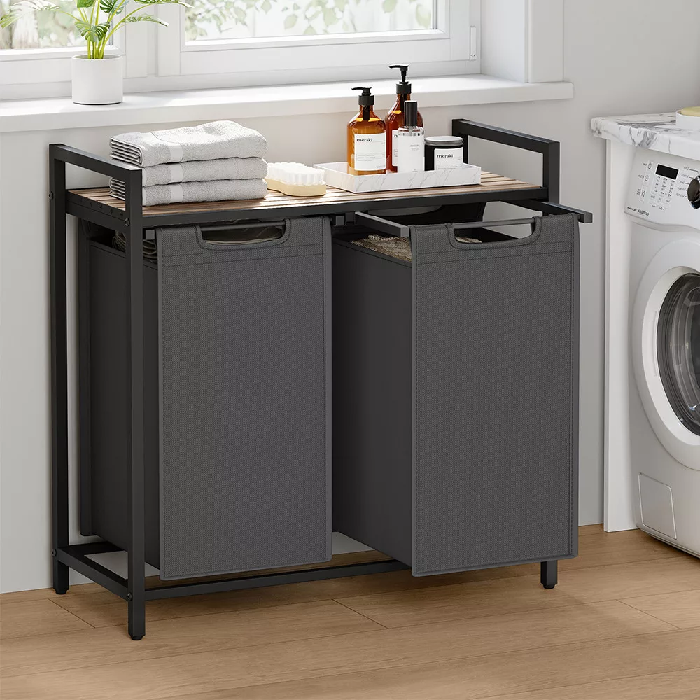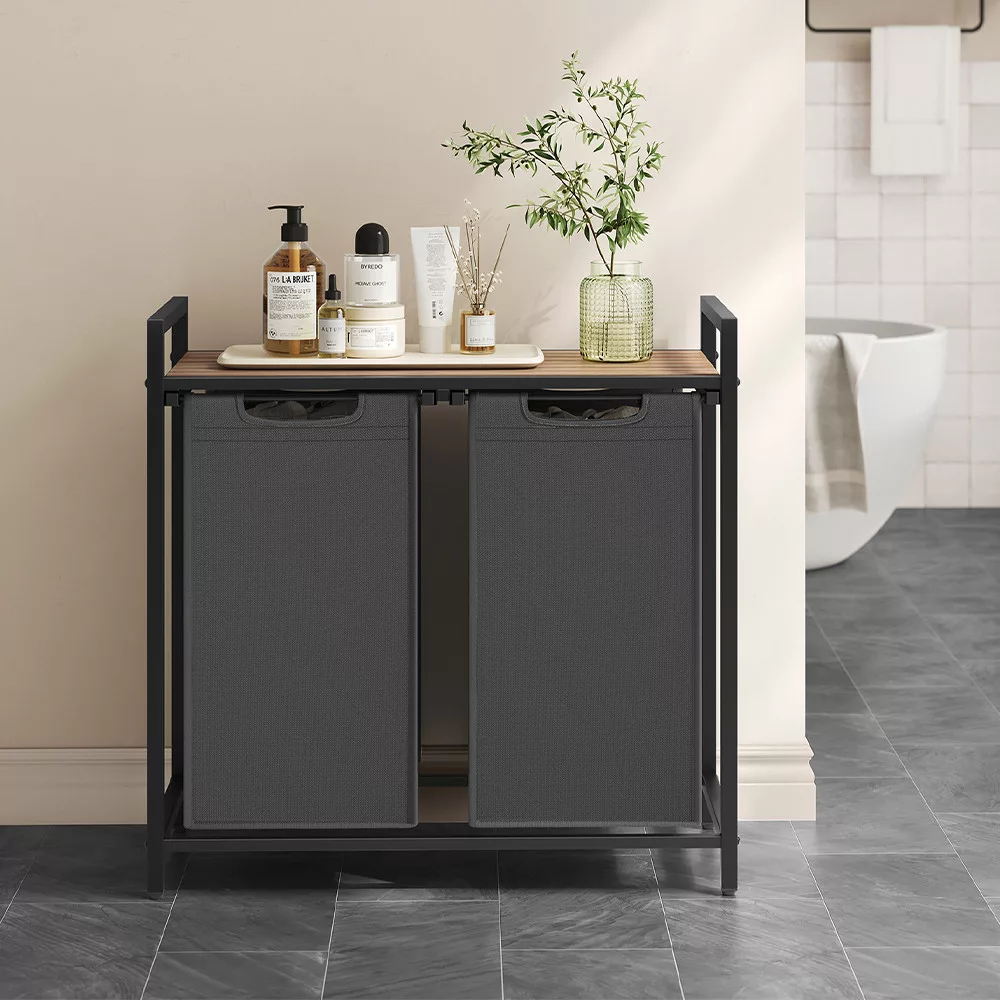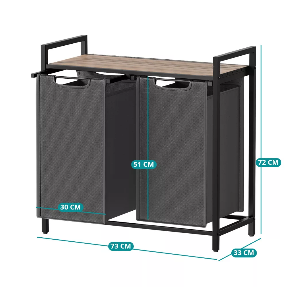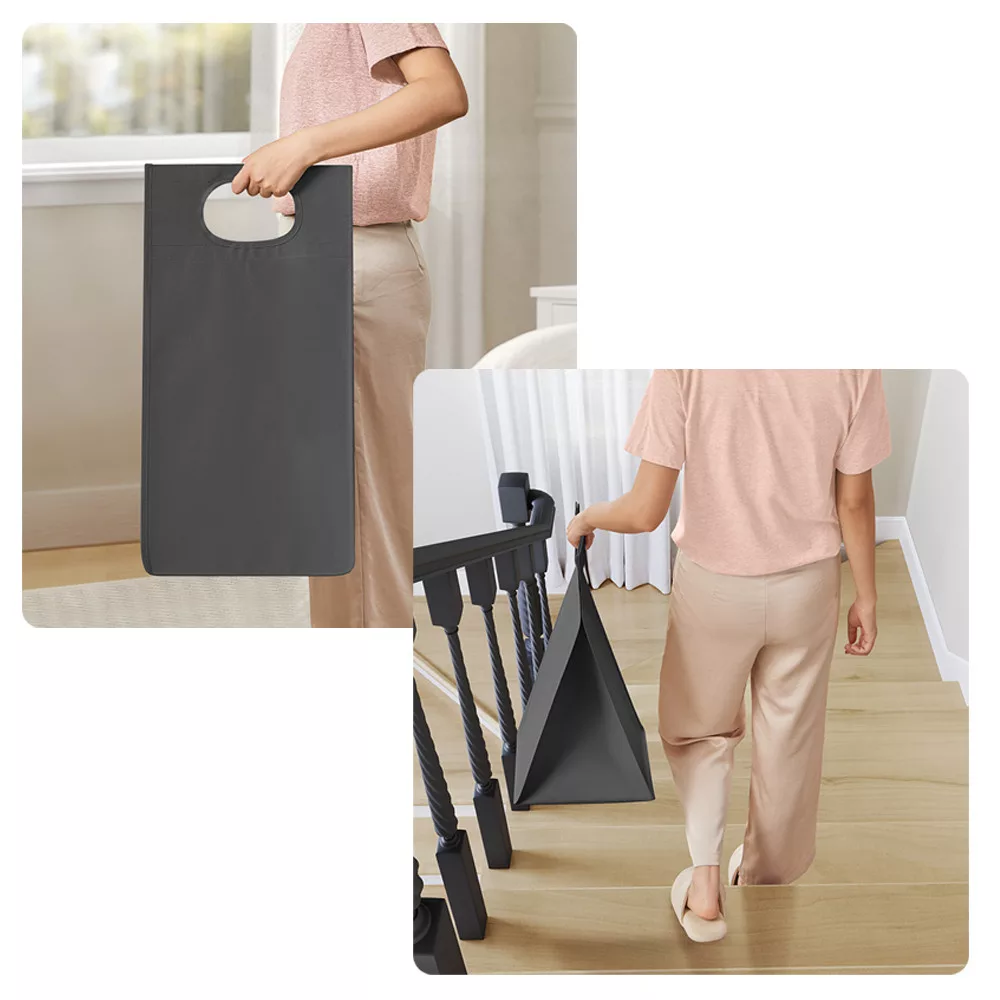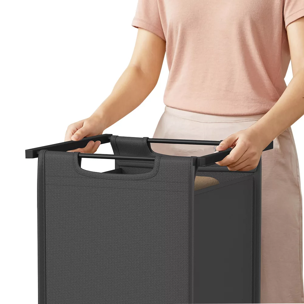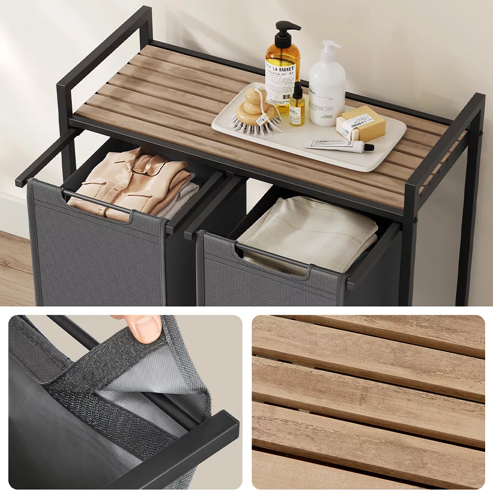 Torbę na pranie można łatwo wysunąć i zdjąć, co ułatwia przenoszenie ich do pralki. Solidna dolna płyta zapobiega deformacji toreb, zapewniając, że pozostaną zarówno estetyczne, jak i praktyczne w użyciu.