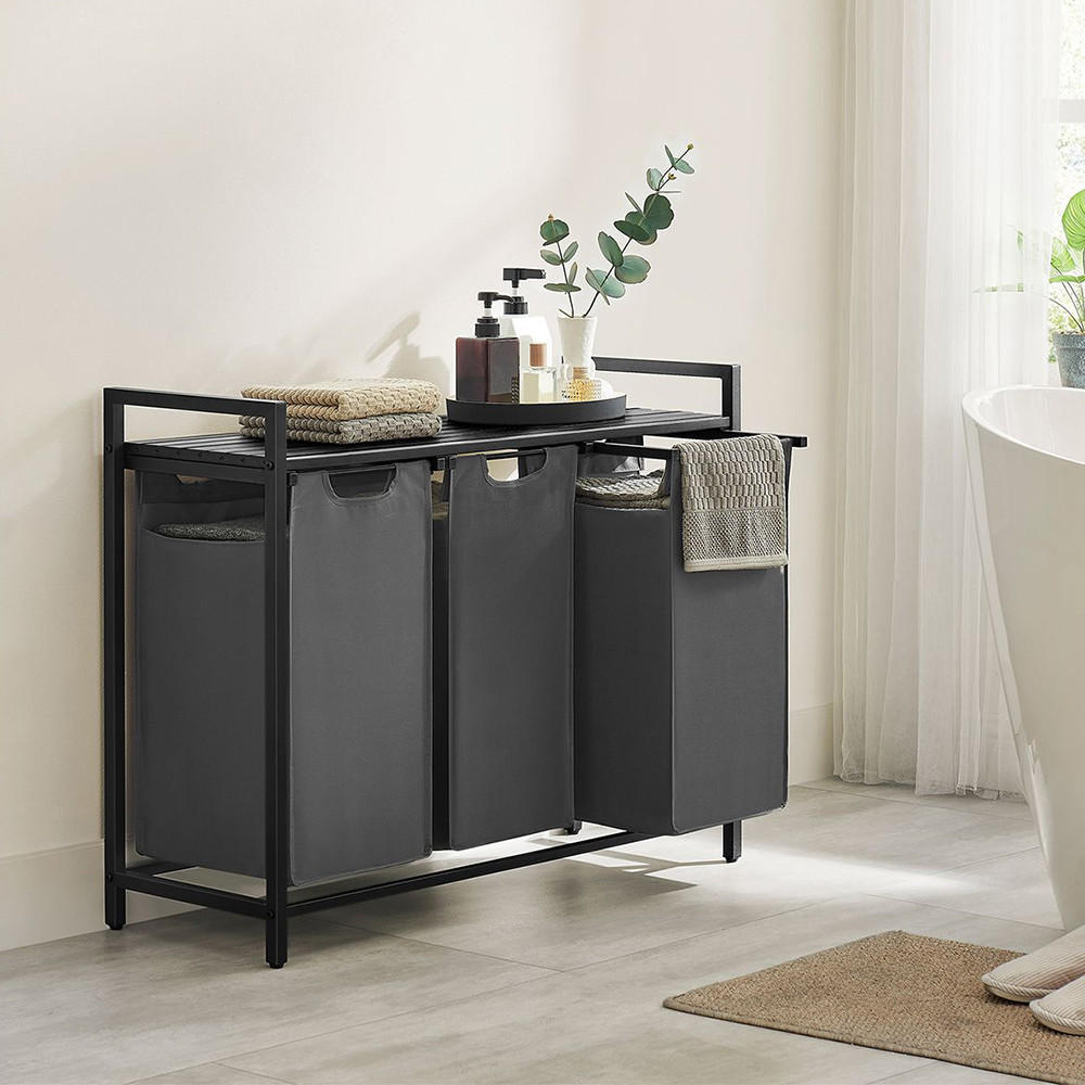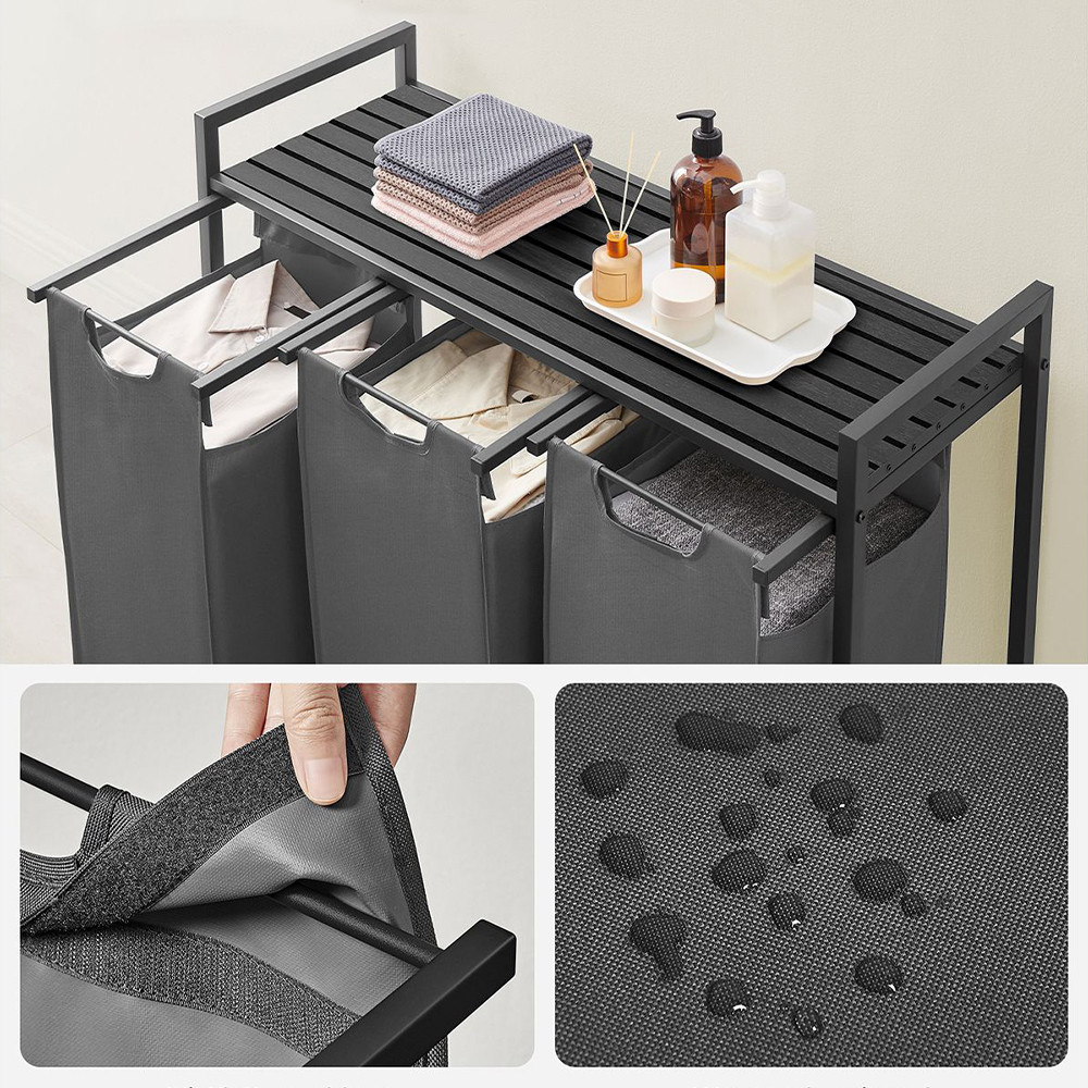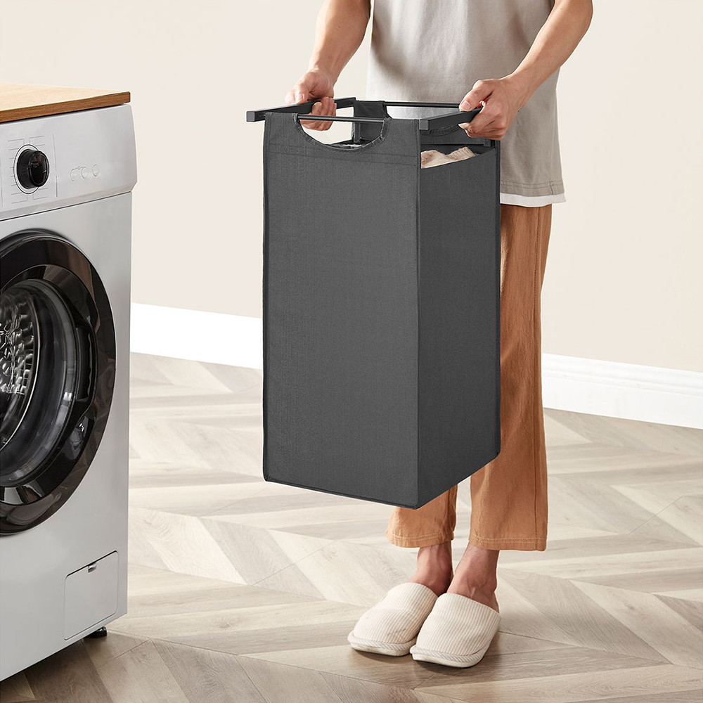 Przy pojemności 114 litrów kosz oferuje trzy przegrody po 38 litrów, dzięki czemu możesz łatwo oddzielić jasne, ciemne i kolorowe tkaniny. Worki można wyjąć, przenosić osobno, a plastikowe wzmocnienia pomagają zachować ich kształt.
