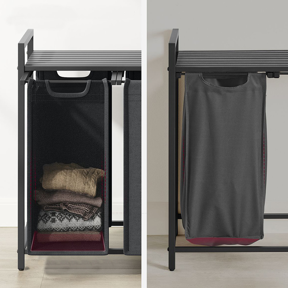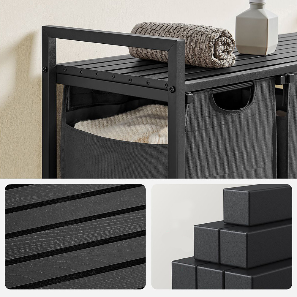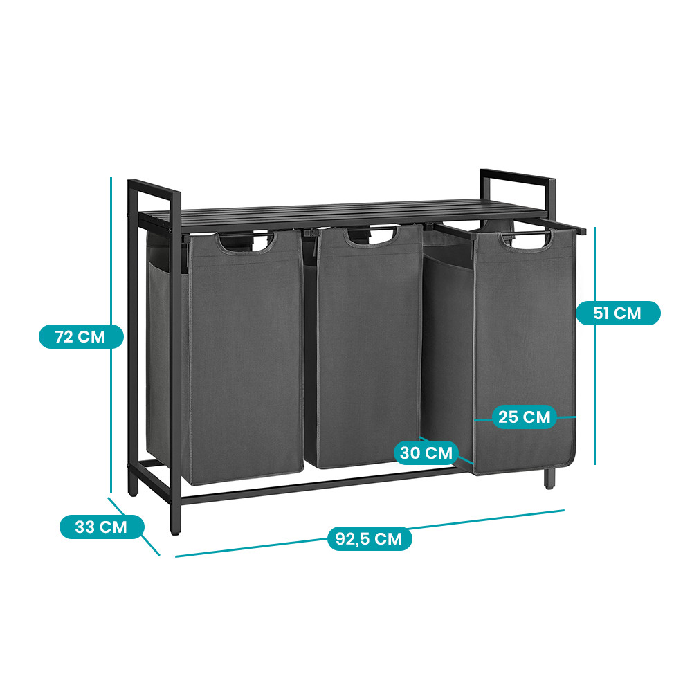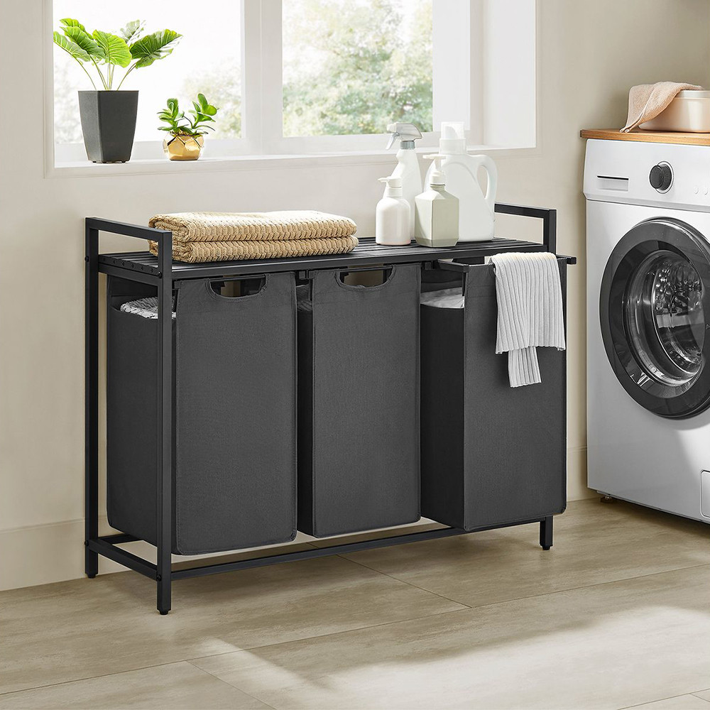 Przy pojemności 114 litrów kosz oferuje trzy przegrody po 38 litrów, dzięki czemu możesz łatwo oddzielić jasne, ciemne i kolorowe tkaniny. Worki można wyjąć, przenosić osobno, a plastikowe wzmocnienia pomagają zachować ich kształt.