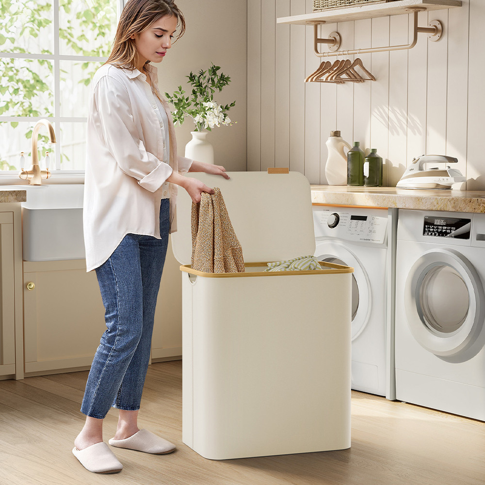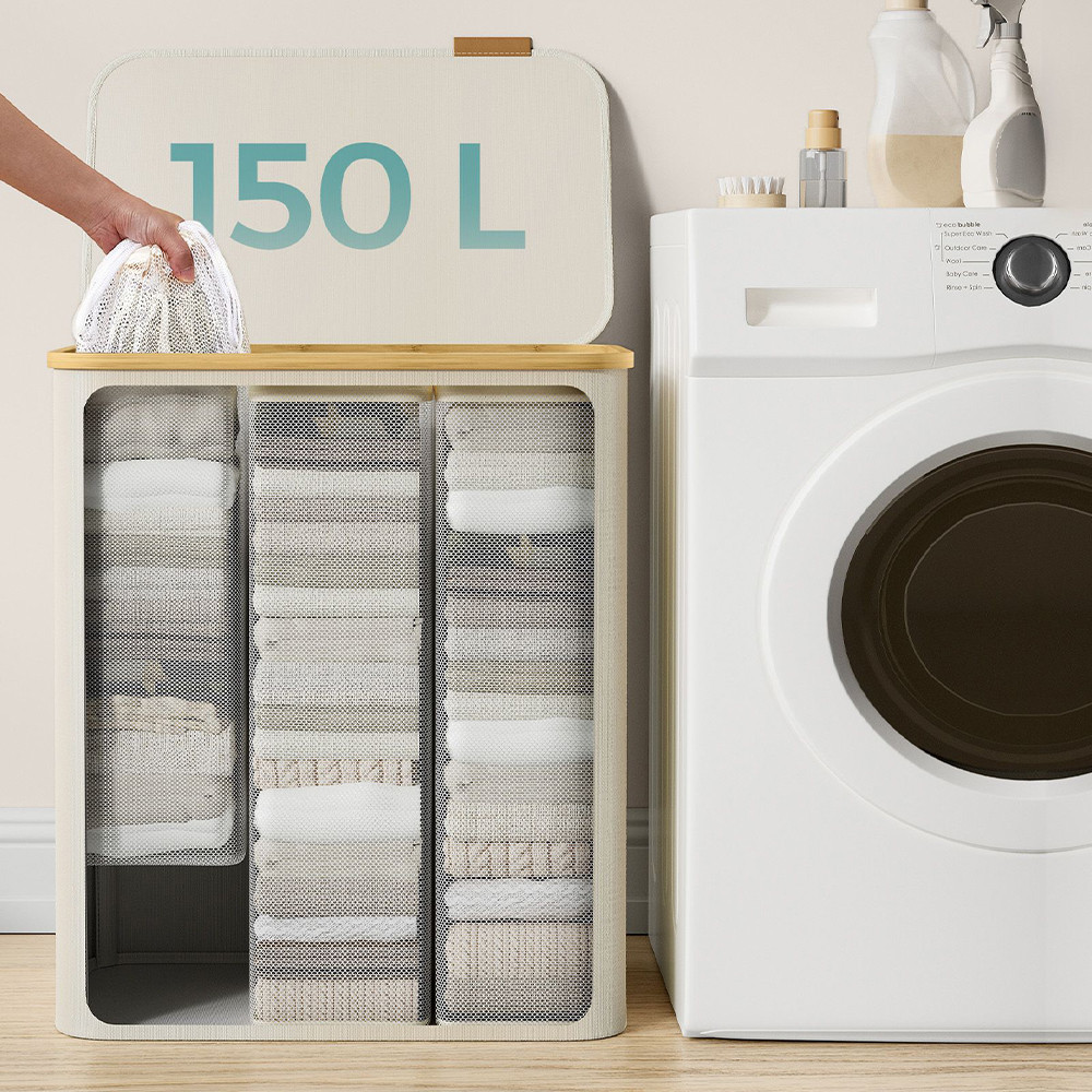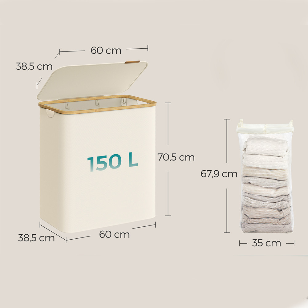 Kosz na pranie ma pojemność 150 litrów, podzieloną na trzy wyraźnie określone sekcje, co pozwala na oddzielne przechowywanie białych, kolorowych lub delikatnych rzeczy. Jest to szczególnie korzystne dla większych gospodarstw domowych, gdzie trzeba zarządzać praniem wielu osób.