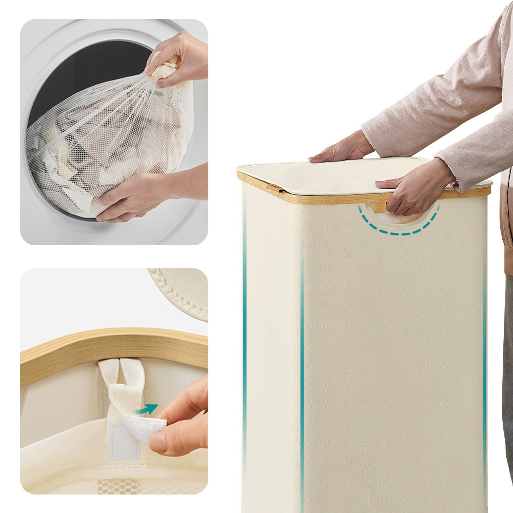 Wewnętrzne siatkowe torby, zabezpieczone rzepem, można łatwo wyjąć, a ich ściągacz służy również jako uchwyt do przenoszenia. Oddychający materiał pozwala na bezpośrednie pranie w pralce, dzięki czemu ubrania są już posortowane podczas przechowywania.