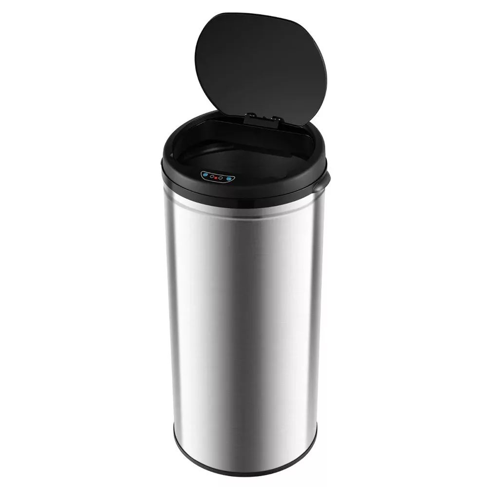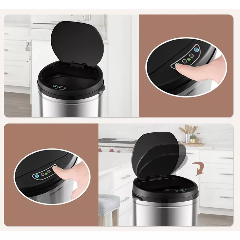 Możesz również ręcznie kontrolować pokrywę za pomocą inteligentnego panelu na koszu. Przycisk "Otwórz" utrzymuje pokrywę otwartą, podczas gdy przycisk "Zamknij" pozwala na powolne i ciche zamknięcie. Daje to wystarczająco dużo czasu na pozbycie się odpadków.