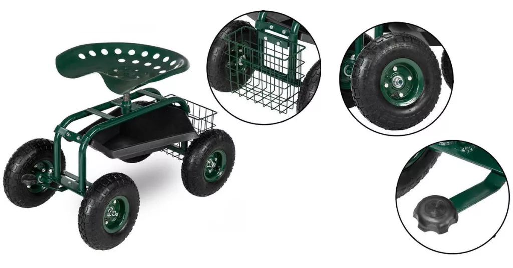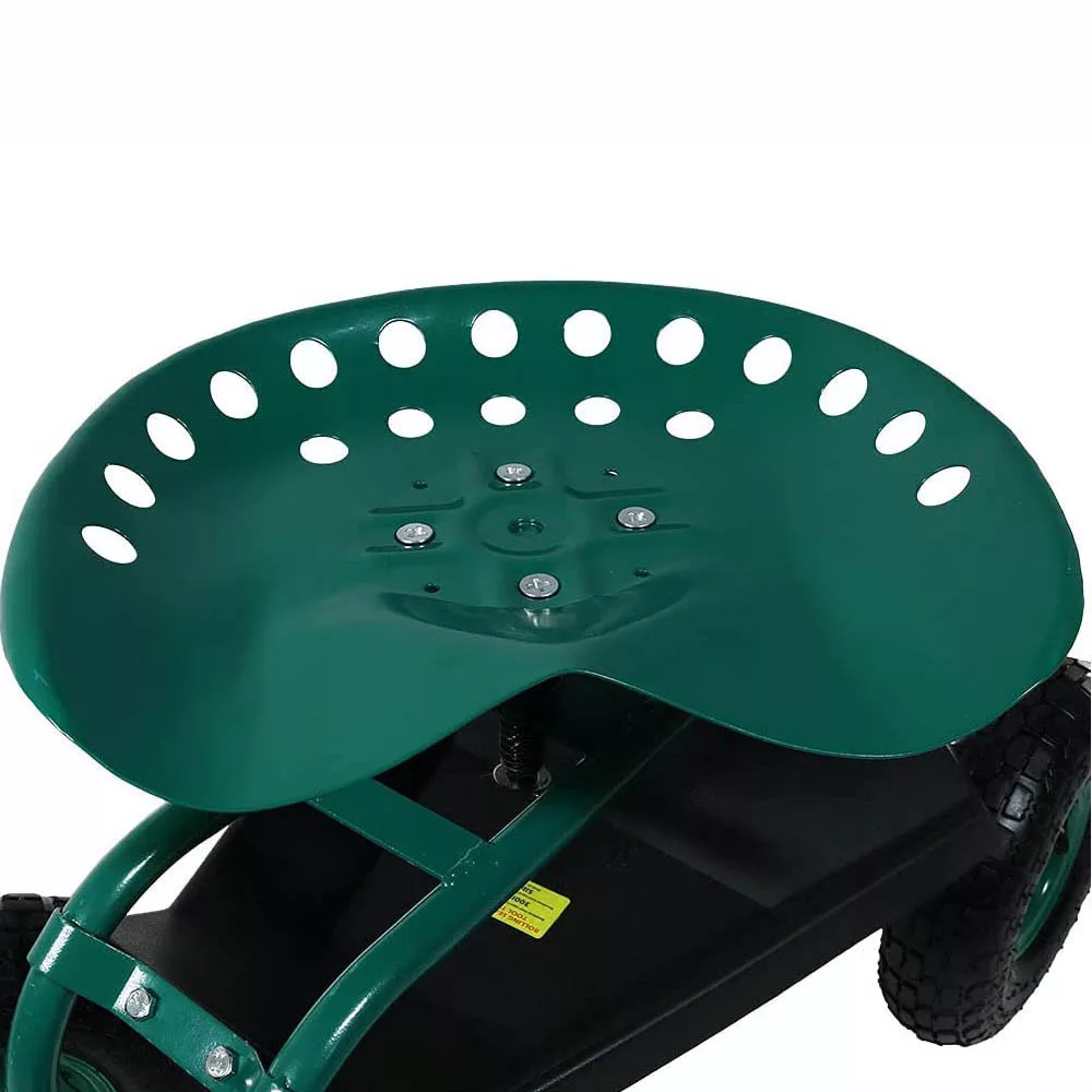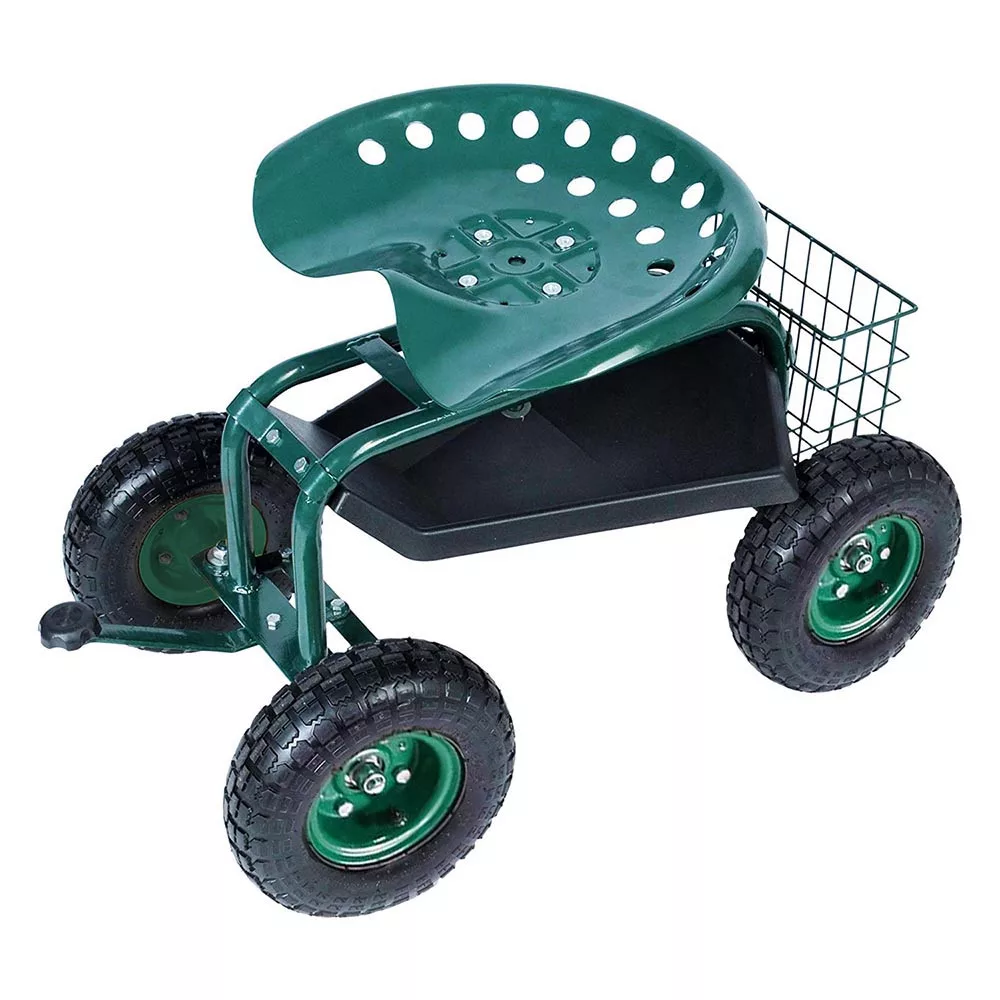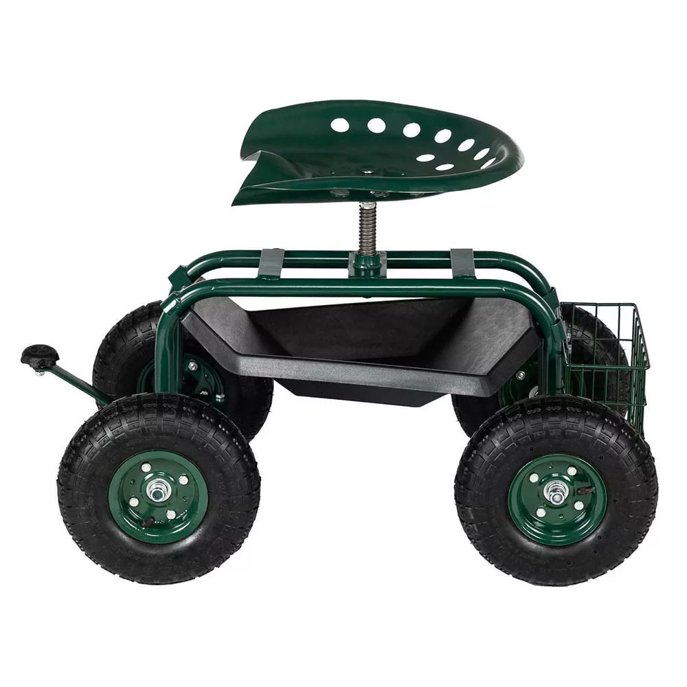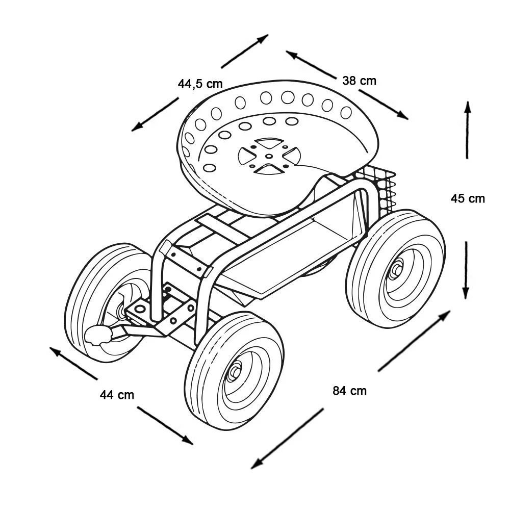 Pod siedziskiem znajduje się przestronny schowek, w którym można przechowywać niezbędne narzędzia, rękawice i akcesoria. Tylni druciany kosz oferuje dodatkowe miejsce na mniejsze przybory lub konewkę, dzięki czemu wszystko jest pod ręką. Duże, gumowe koła zapewniają łatwe przemieszczanie się po różnych powierzchniach – trawie, żwirze czy ziemi.