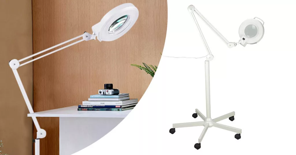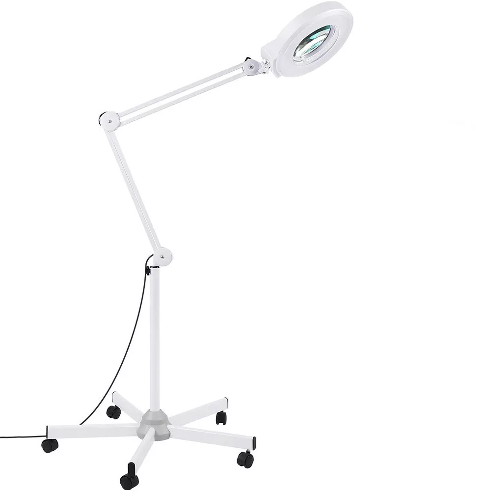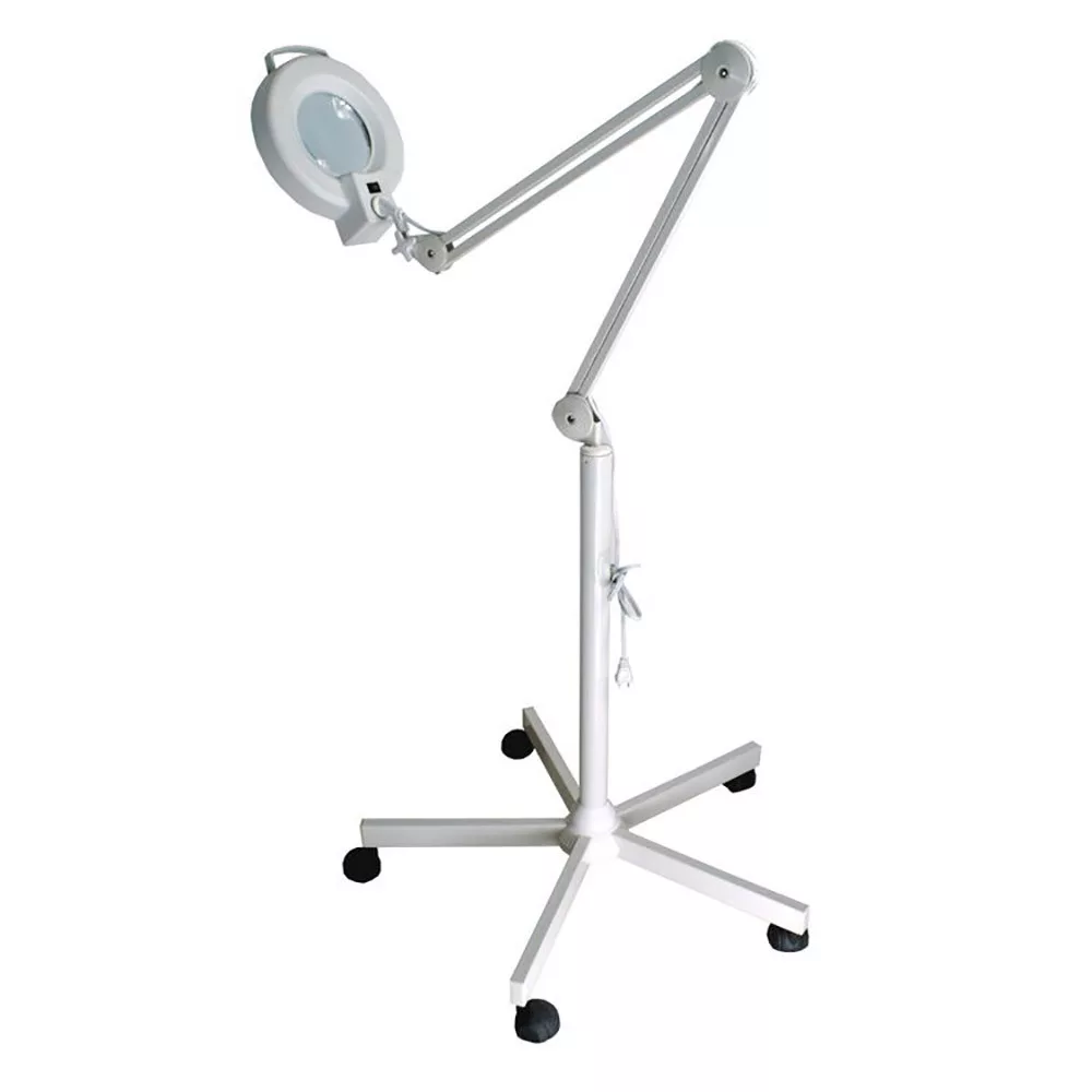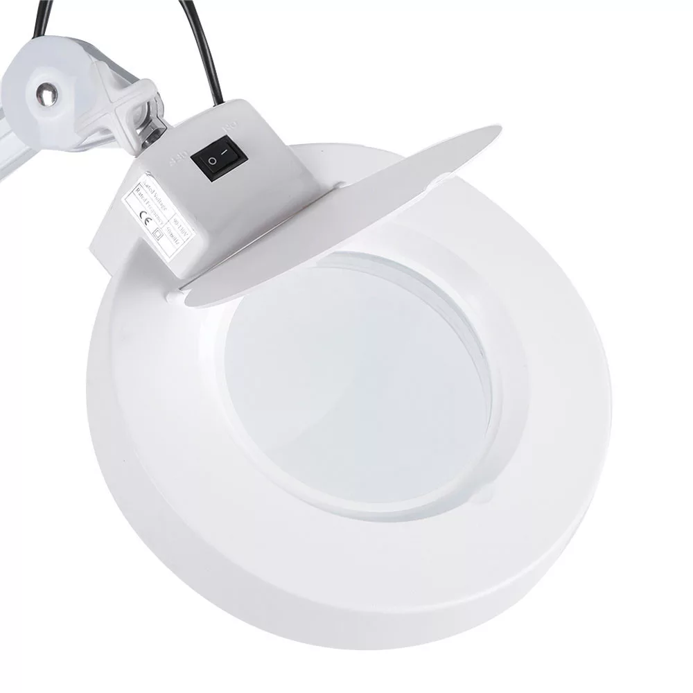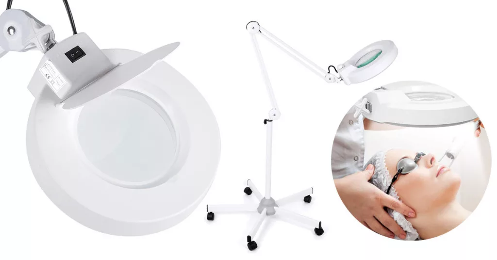 Stojak kosmetyczny wyposażony jest w okrągłą lupę o średnicy 25 cm i powiększeniu 8 dioptrii, co czyni go doskonałym narzędziem do dokładnych zabiegów, takich jak manicure, pedicure czy kosmetyka twarzy. 40 energooszczędnych diod LED zapewnia równomierne, nieoślepiające światło, umożliwiając doskonałą widoczność nawet najmniejszych detali.