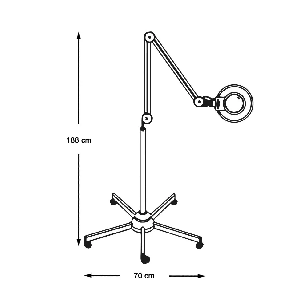 Stojak składa się z trzech segmentów, co pozwala na regulację wysokości do maksymalnie 188 cm, dostosowując się do różnych stanowisk pracy. Stabilna podstawa na kółkach gwarantuje pewność użytkowania, a jednocześnie ułatwia przemieszczanie lampy.