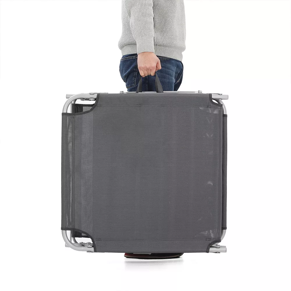 Składana konstrukcja i praktyczne uchwyty ułatwiają przenoszenie leżaka w ogrodzie, na tarasie, a nawet na plaży.