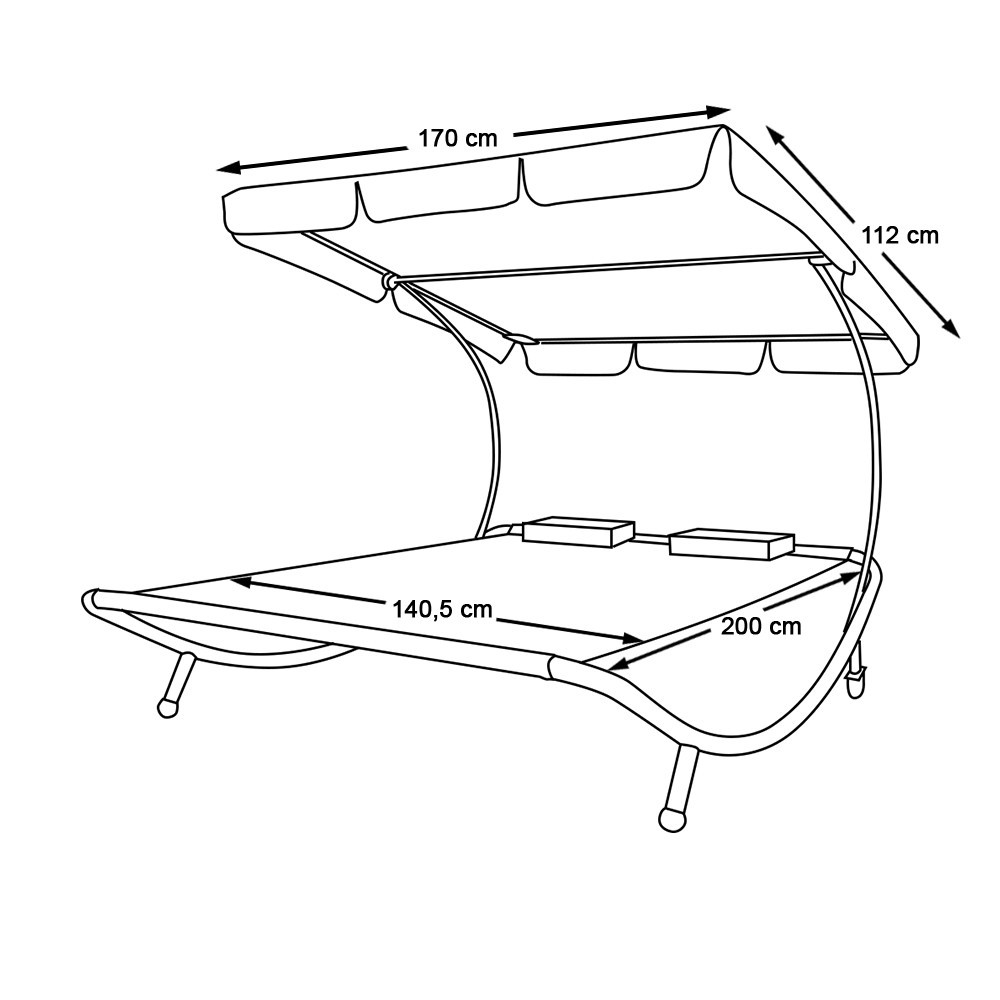 To podwójne łóżko ogrodowe to doskonały wybór, jeśli chcesz odpocząć na świeżym powietrzu z partnerem. Regulowany daszek chroni przed słońcem, wbudowane kółka umożliwiają łatwe przestawianie, a dołączone poduszki zapewniają dodatkowy komfort. Idealne na większe tarasy lub do ogrodu.