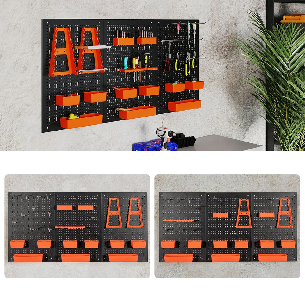 Równo rozmieszczone otwory pozwalają na dostosowanie przegrody, haków i uchwytów według potrzeb. Klucze, wkrętaki, wiertła i mniejsze narzędzia mogą znaleźć swoje miejsce.