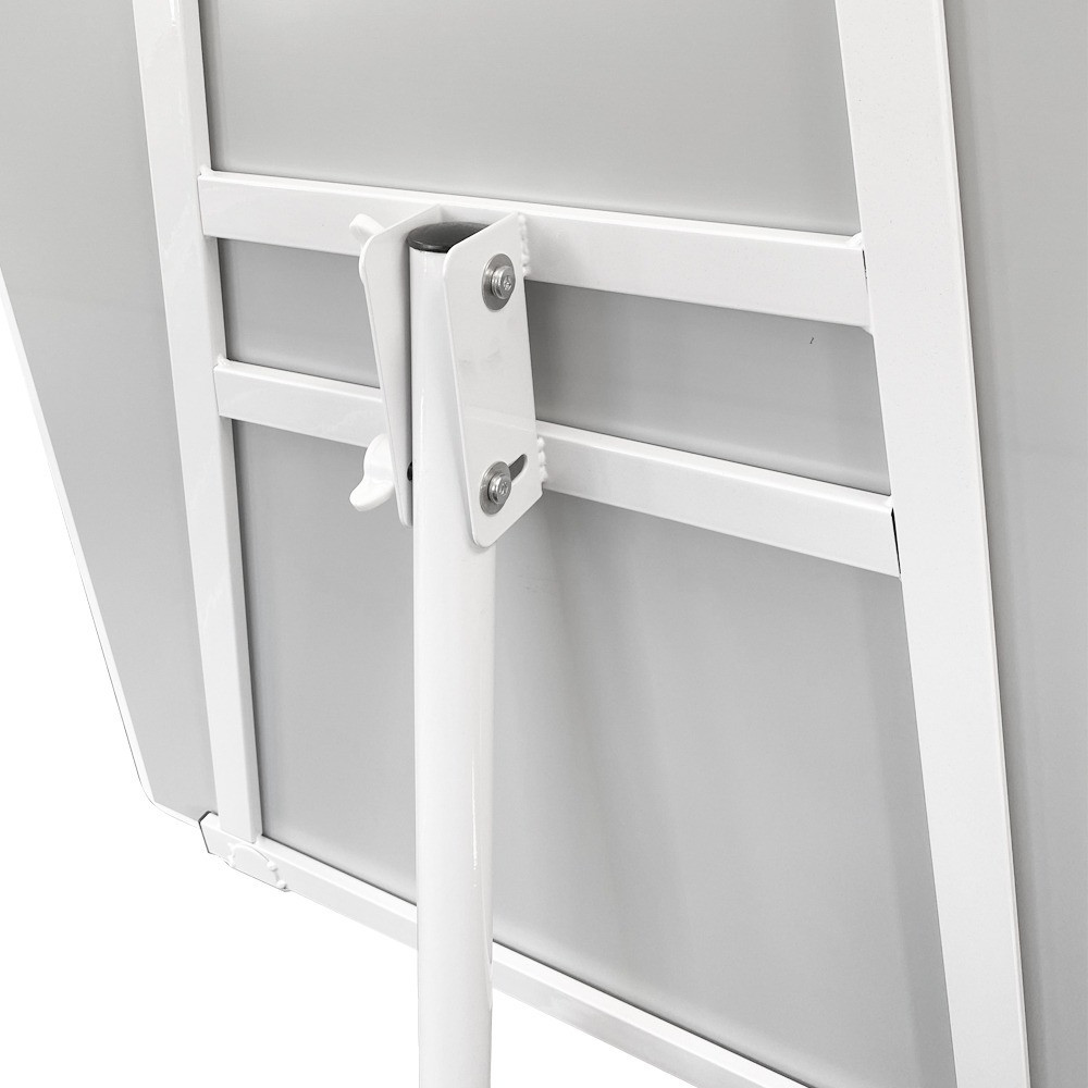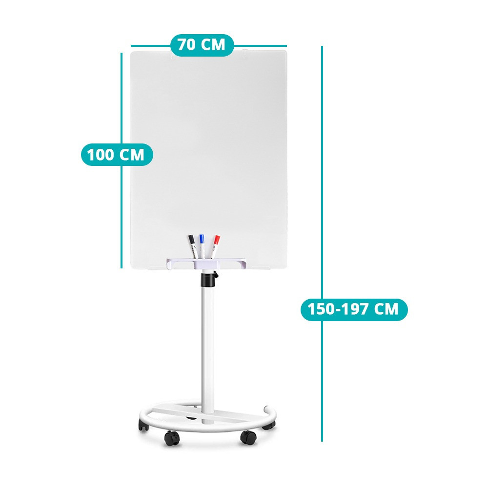 Tablica flipchart z magnetyczną powierzchnią pozwala na przypinanie papierowych notatek, wykresów i dokumentów, a także pisanie markerami suchościeralnymi, co czyni ją wszechstronnym i skutecznym narzędziem komunikacji. Hamowane kółka zapewniają stabilność i łatwe przemieszczanie, dzięki czemu można jej używać w różnych środowiskach.