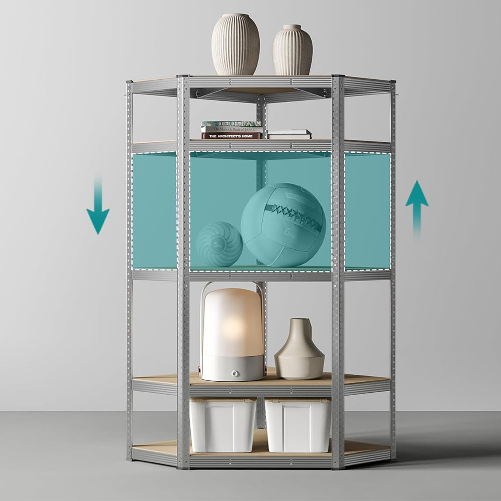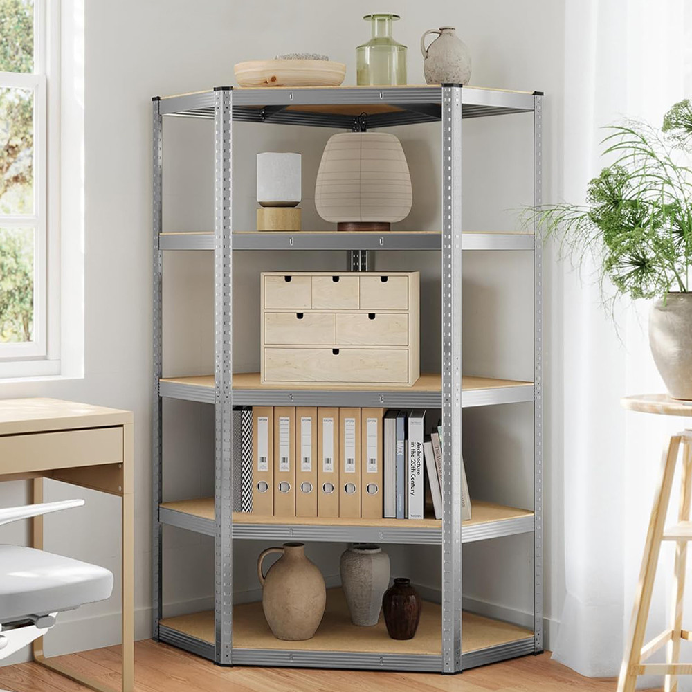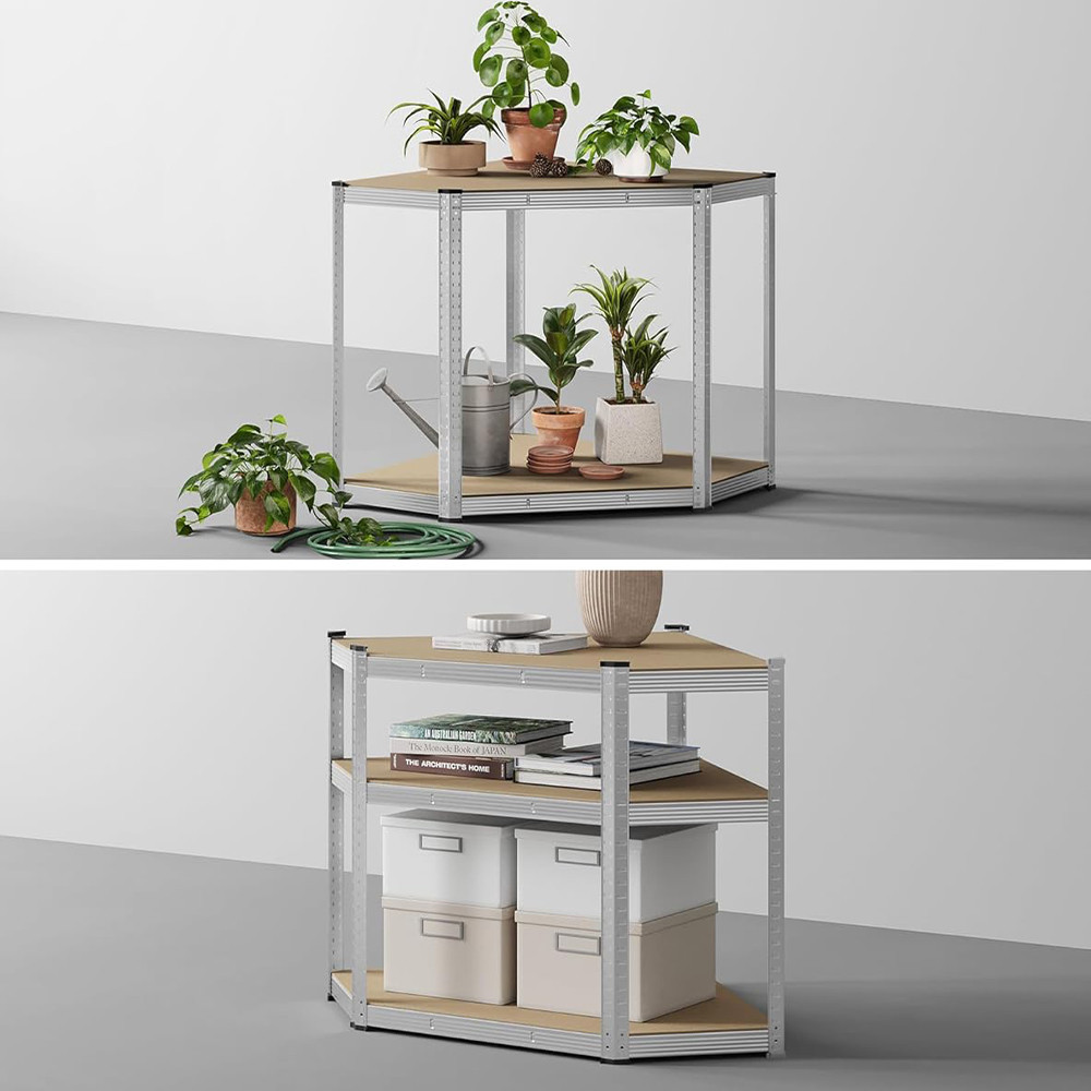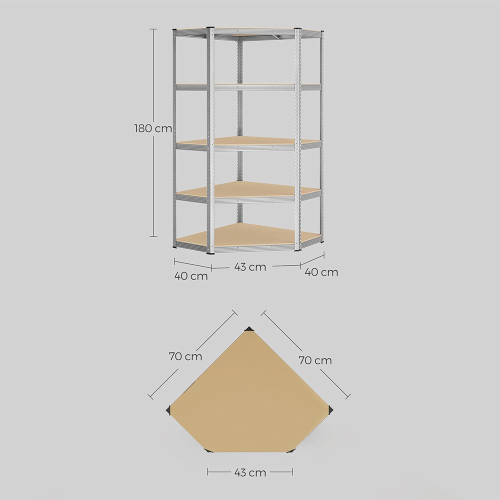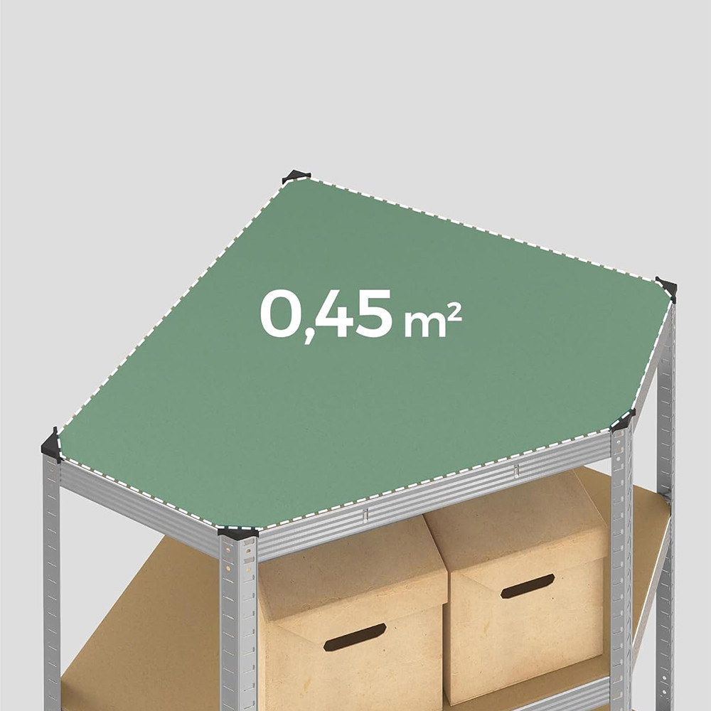 Praktyczny regał narożny pozwala wykorzystać nawet najwęższe zakątki garażu lub warsztatu. Dzięki wymiarom podstawy 70 x 70 cm i wysokości 180 cm oferuje dużo miejsca do przechowywania, nie przeszkadzając w codziennym użytkowaniu.