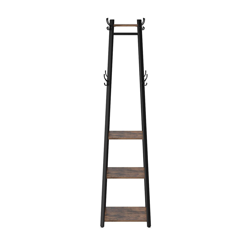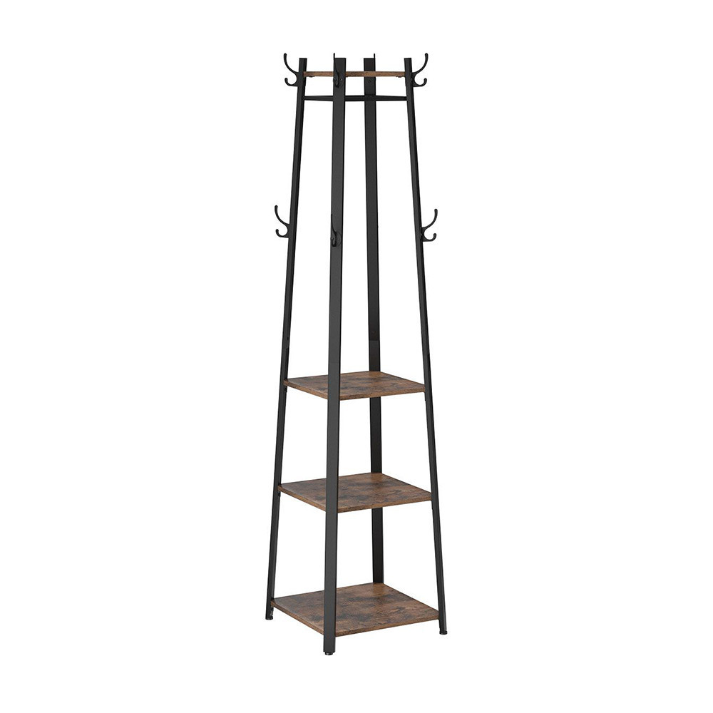 Połączenie stalowej konstrukcji w stylu industrialnym i rustykalnych półek tworzy nowoczesną, a jednocześnie przytulną atmosferę. Wieszak to nie tylko praktyczne miejsce do przechowywania, ale również wyrazisty element wystroju, który natychmiast ożywi przedpokój lub róg salonu.