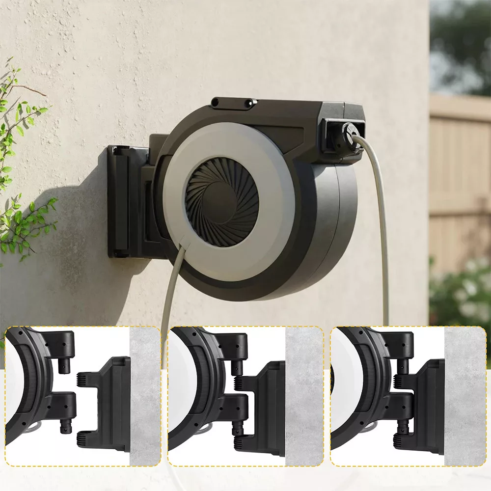 Uchwyt ścienny jest obrotowy, co ułatwia kierowanie węża tam, gdzie akurat pracujesz. Wbudowana rączka pozwala również trzymać skrzynkę w ręce, gdy czasem potrzebujesz jej w innym miejscu. Idealny do podlewania, sprzątania podwórka, mycia auta lub spłukiwania psa.