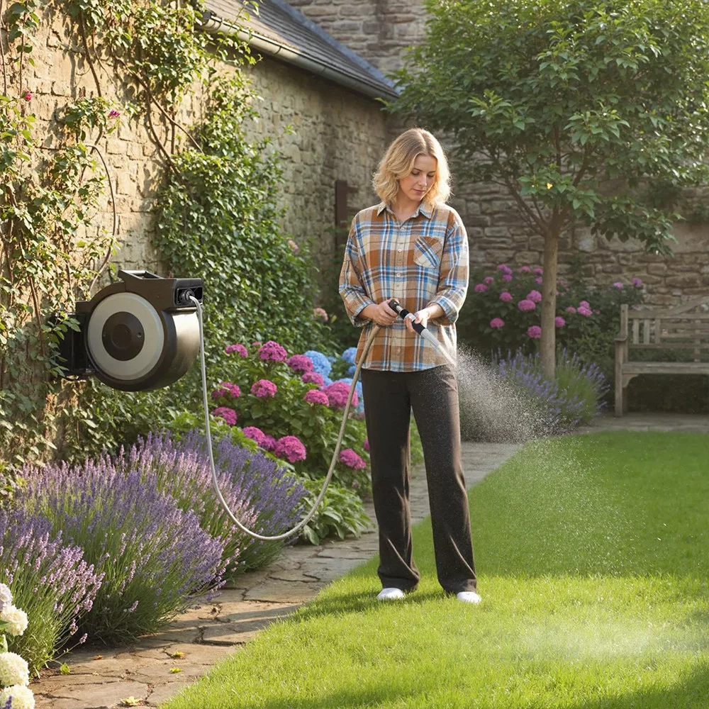 Jeśli podlewasz różne miejsca w ogrodzie, przyda się, że wąż jest zawsze pod ręką, ale nie wala się na podłodze. Wyciągasz odpowiednią długość, docierasz do rabatki, tarasu czy nawet do samochodu, i nie musisz omijać splątanych pętli.