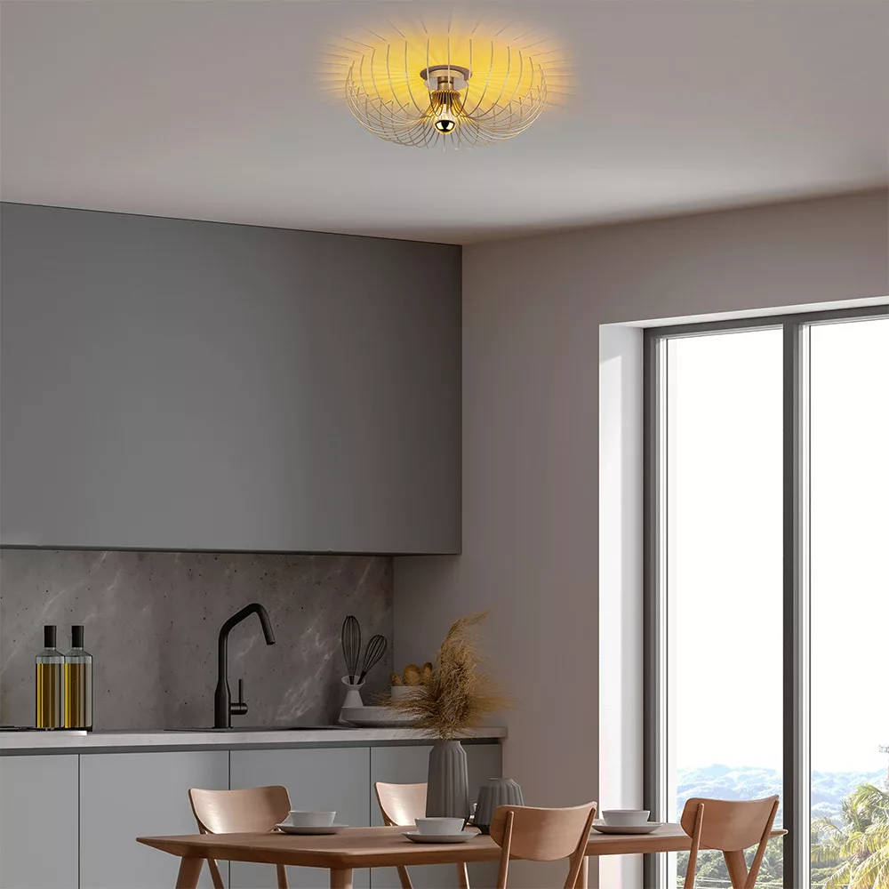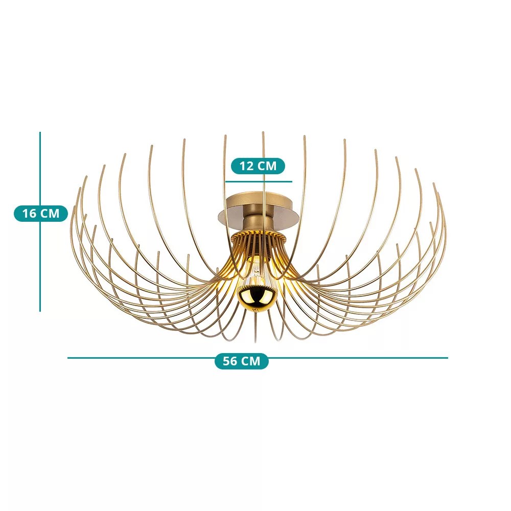 Zakrzywione metalowe elementy tworzą unikalny efekt cienia na suficie, sprawiając, że lampa jest nie tylko źródłem światła, ale także dekoracyjnym punktem centralnym. Złoty odcień dodaje eleganckiej, ciepłej atmosfery przestrzeni.