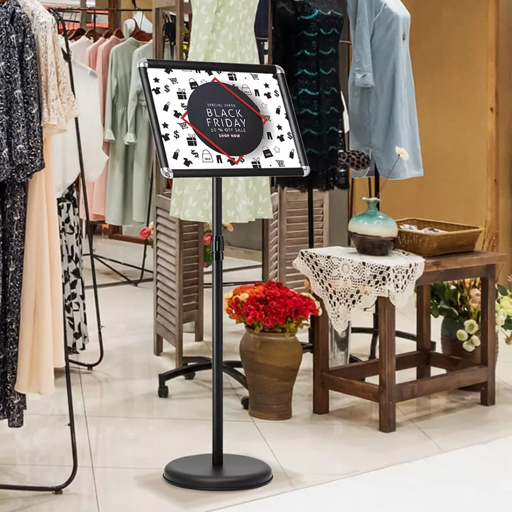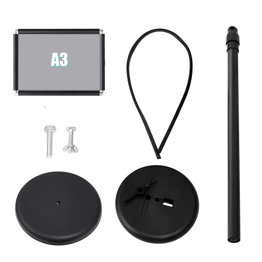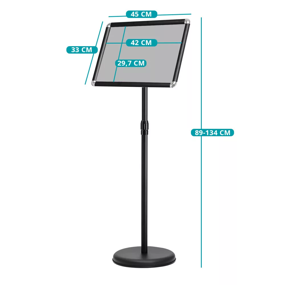 Ten obrotowy stojak informacyjny A3 oferuje eleganckie i praktyczne rozwiązanie dla sklepów, wystaw, wydarzeń lub biur. Dzięki smukłej aluminiowej ramie i stalowej podstawie, wprowadza nowoczesny akcent do każdego otoczenia.