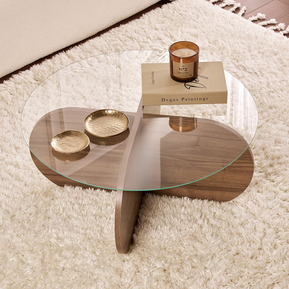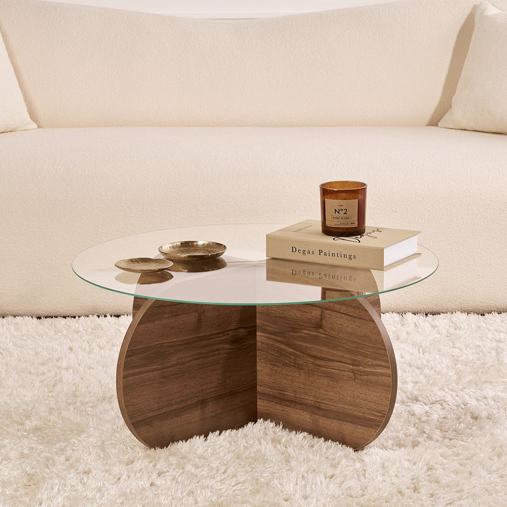 Przezroczysty szklany blat dodaje lekkości do salonu, zapewniając jednocześnie wystarczająco dużo miejsca na napoje, książki lub dekoracje. To idealny element centralny do relaksu.