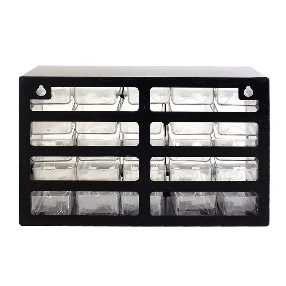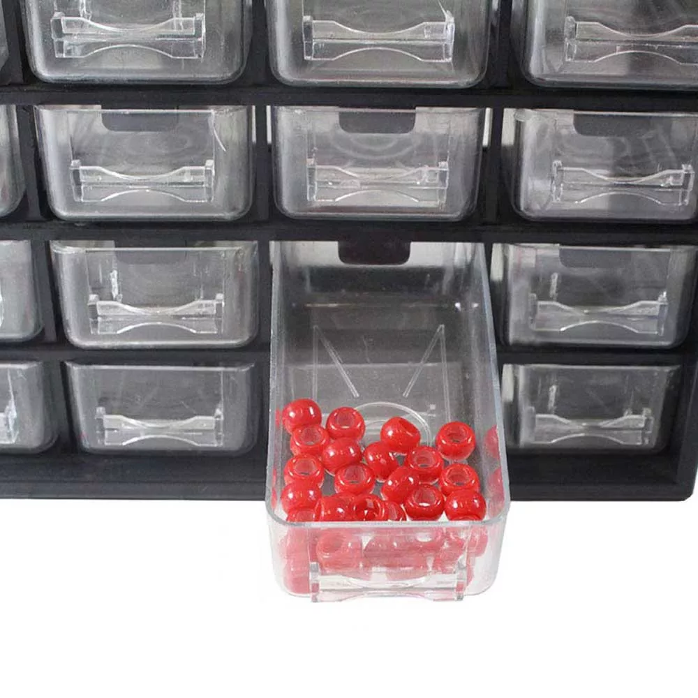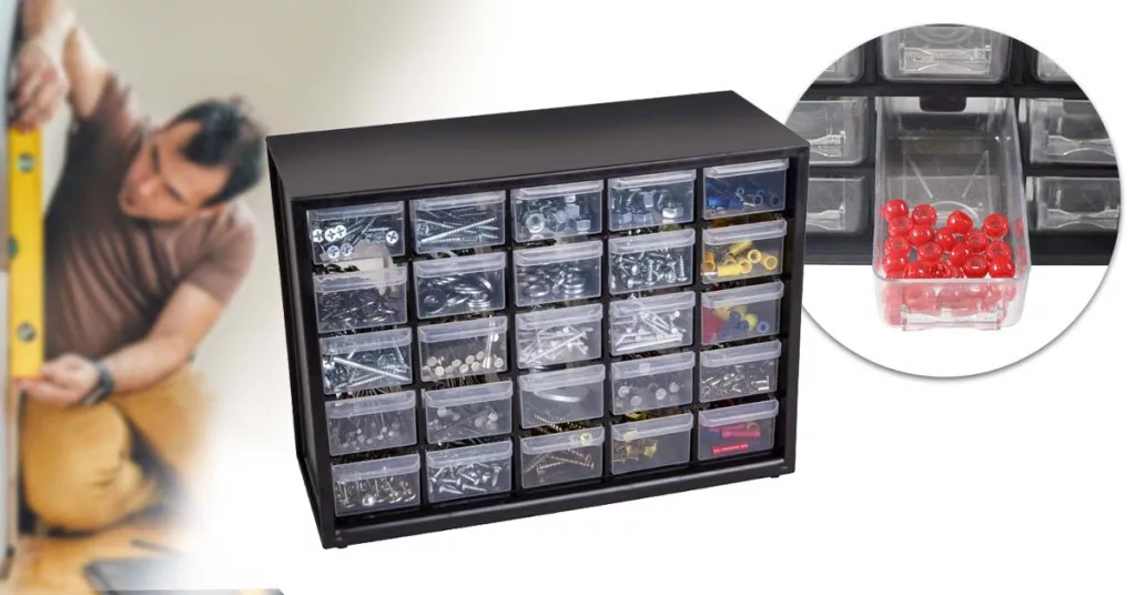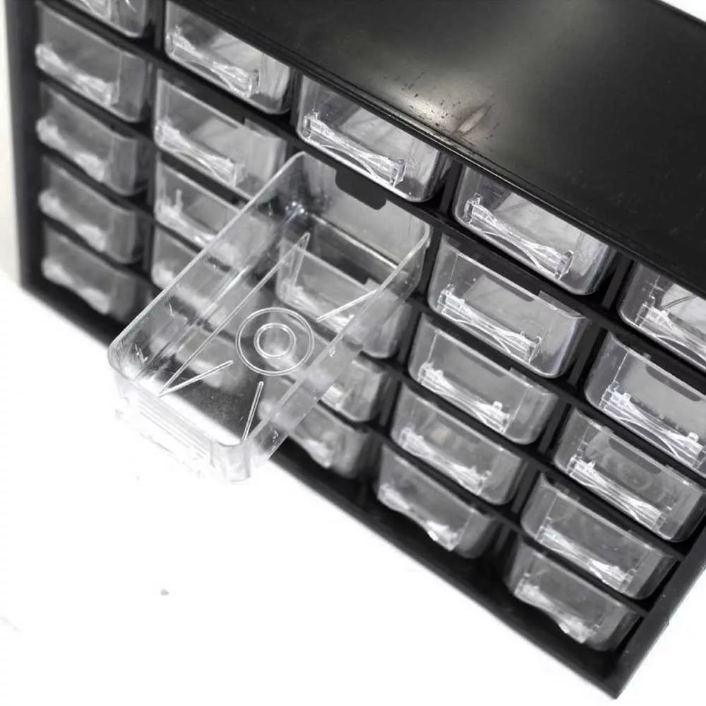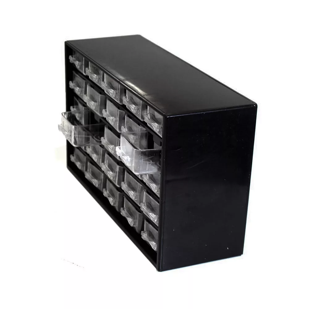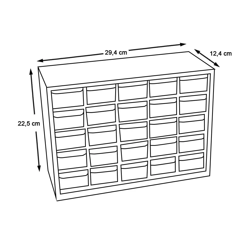 Dzięki 25 przegródkom każda część ma swoje miejsce, co zapobiega bałaganowi i gubieniu śrubek. Przezroczyste szufladki pozwalają na szybkie odnalezienie potrzebnych elementów, eliminując czasochłonne poszukiwania. Specjalnie zaprojektowane ranty zapobiegają wypadaniu szufladek, nawet przy pełnym wysunięciu.