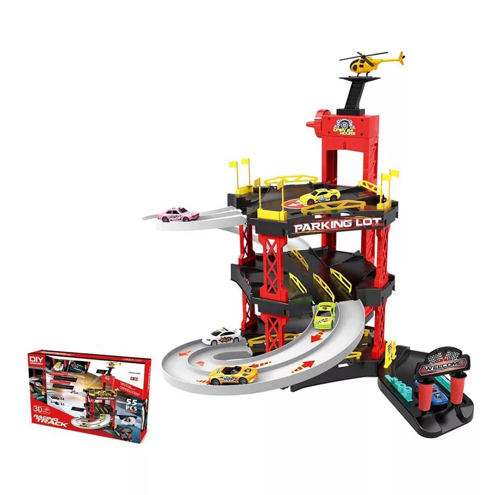 Zestaw może być idealnym miejscem do parkowania samochodzików Twoich dzieci. Dzięki dużej rampie, windzie oraz miejscu do lądowania dla helikopterów, zapewnia świetną zabawę zarówno młodszym jak i starszym dzieciom. 55-częściowy zestaw zawiera również 4 losowo dobrane samochodziki oraz 1 helikopter.