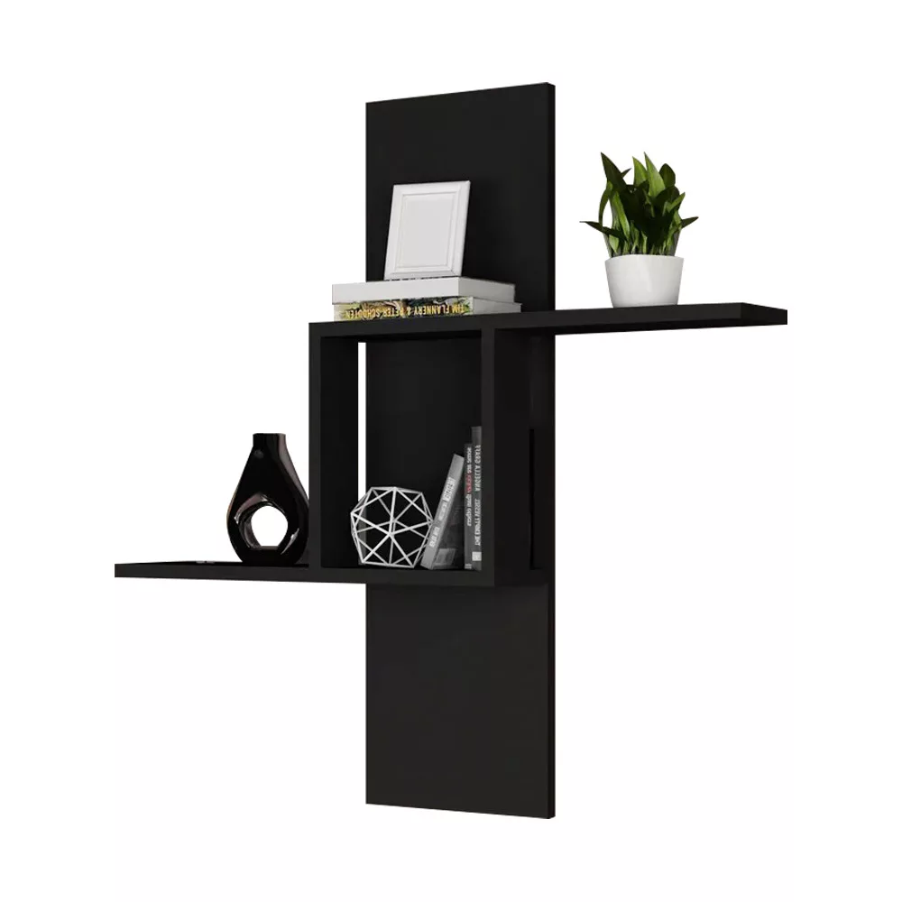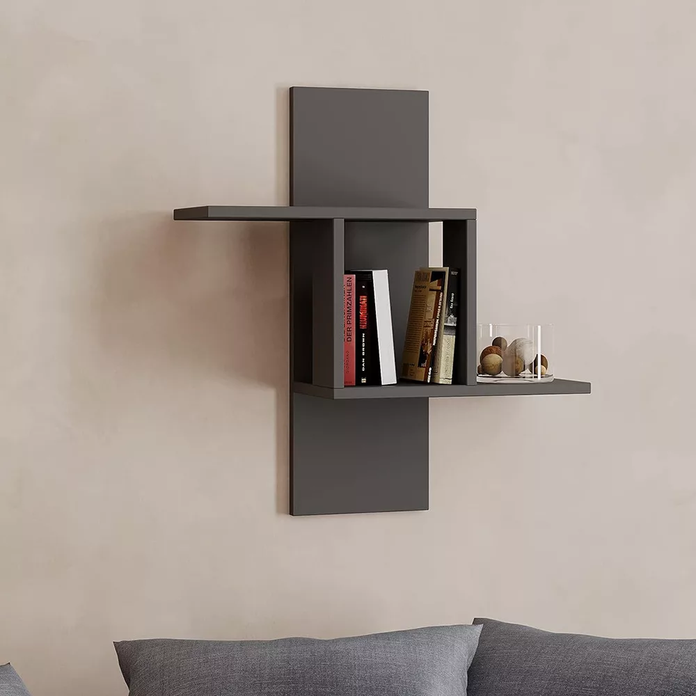Antracytowa półka ścienna zapewnia czysty, ale odważny wygląd. Jej geometryczny design wizualnie powiększa przestrzeń, jednocześnie oferując praktyczne opcje przechowywania.