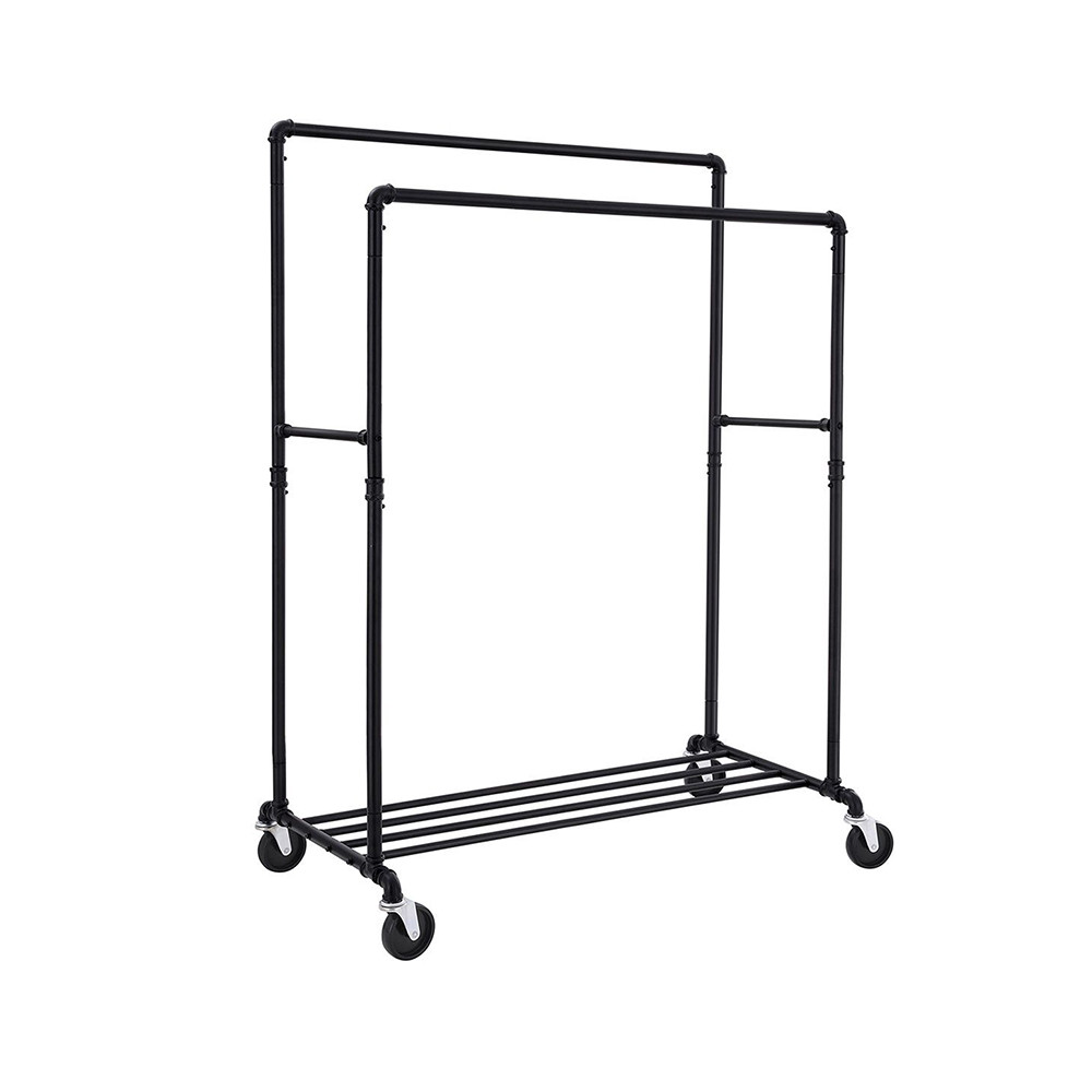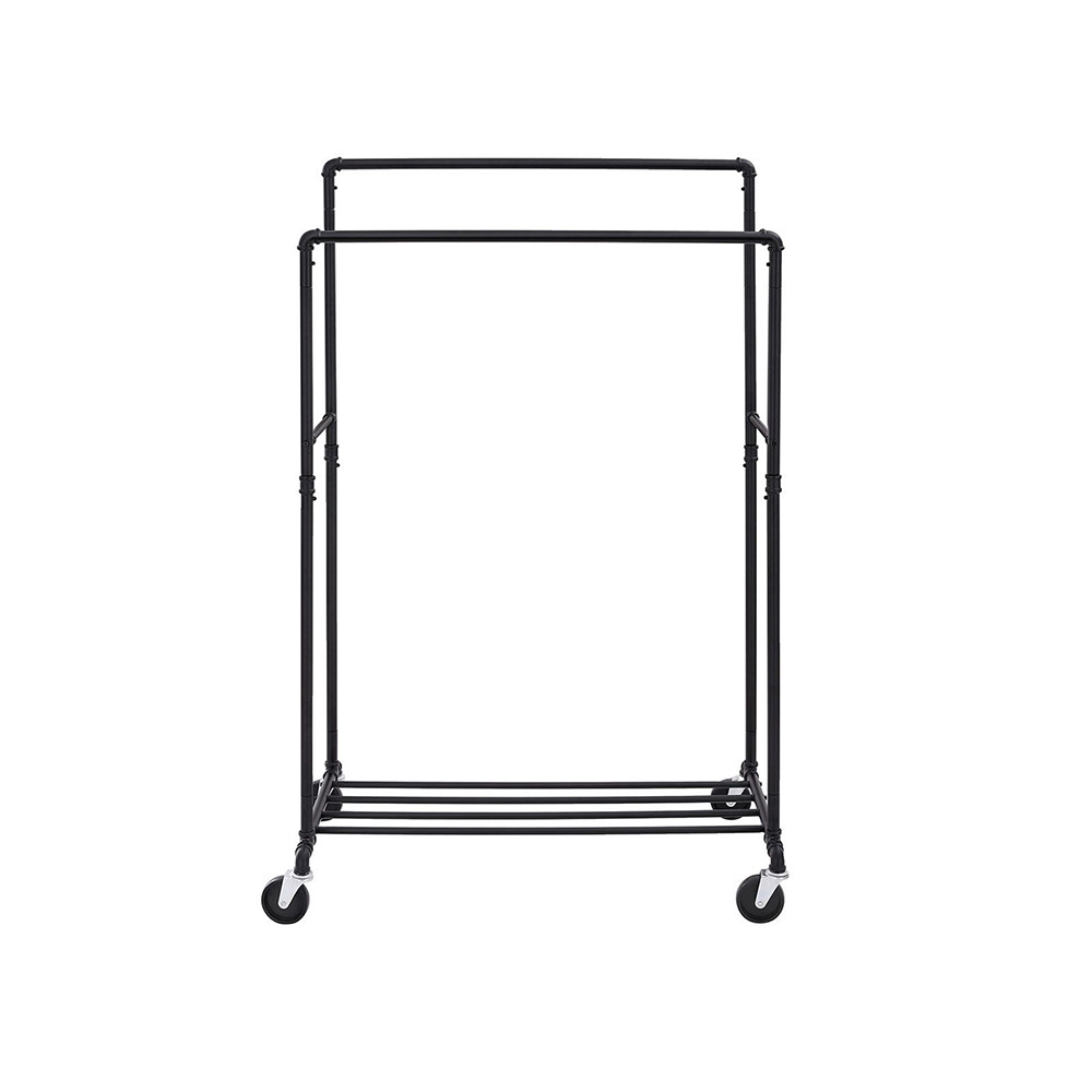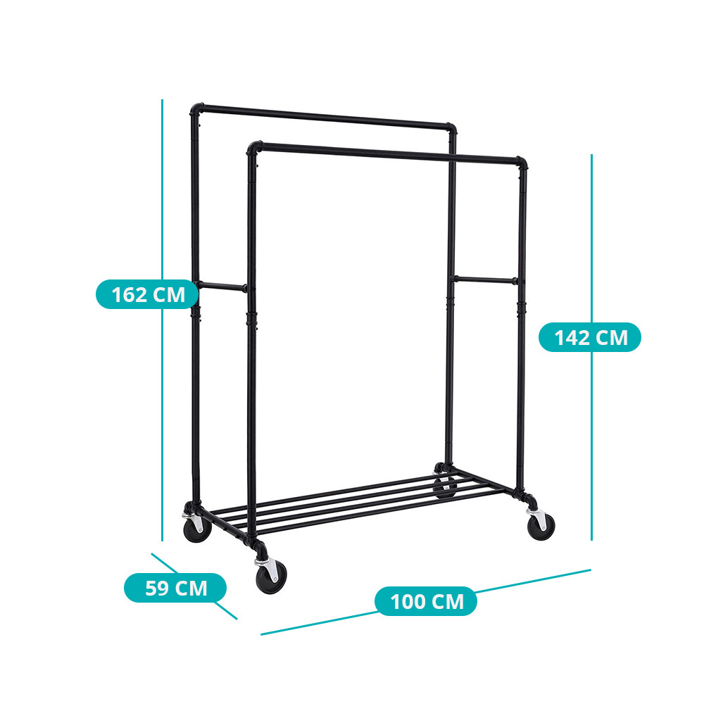 Ten podwójny stojak na ubrania na kółkach to połączenie nowoczesnego, industrialnego wyglądu z praktycznym zastosowaniem. Świetnie sprawdzi się w sypialni, pralni lub sklepie.
