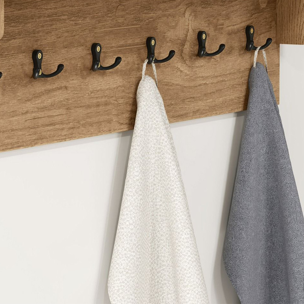 Solidna konstrukcja drewniana zapewnia trwałość, a nawiercone otwory i dołączone elementy montażowe umożliwiają szybki i bezproblemowy montaż. Gładkie, pozbawione zadziorów haczyki chronią ubrania i gwarantują bezpieczne użytkowanie.