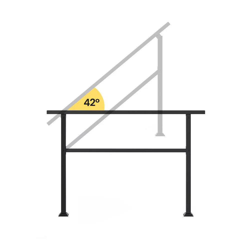 Regulowany kąt 42° pozwala na idealne dopasowanie poręczy do różnych nachyleń schodów. Kompatybilna z wzniesieniami 0–4 stopni, jest doskonałym wyborem do wejść domowych, tarasów lub nawet bocznych wejść.
