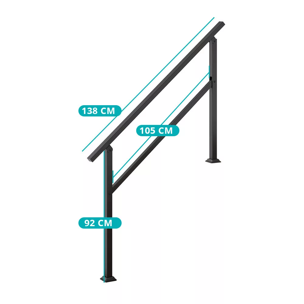 Ta mocna metalowa poręcz schodowa oferuje niezawodne wsparcie dla schodów zewnętrznych, tarasów i wejść. Jej solidna konstrukcja wytrzymuje obciążenie do 150 kg, co czyni ją idealną dla wszystkich grup wiekowych – szczególnie dla seniorów i dzieci.