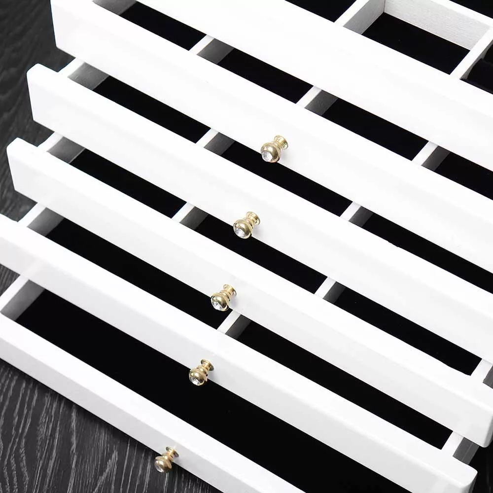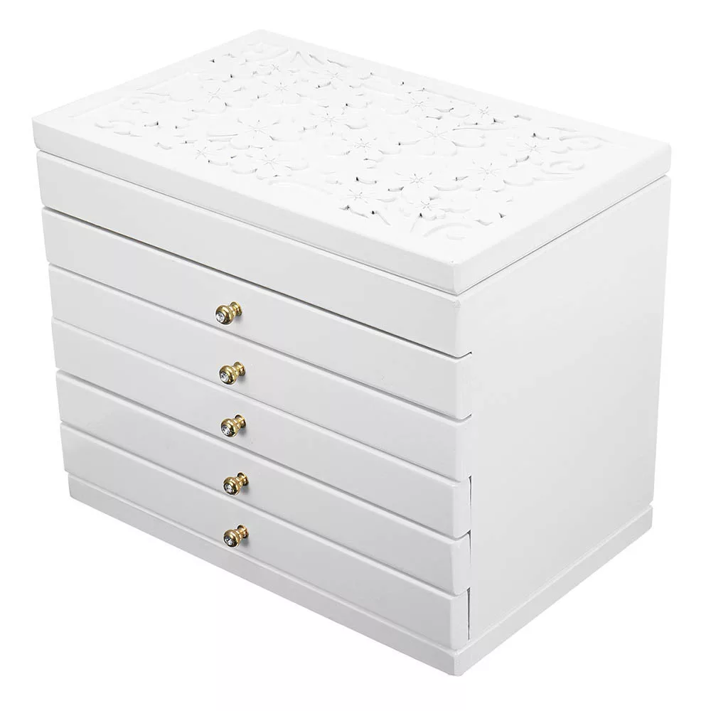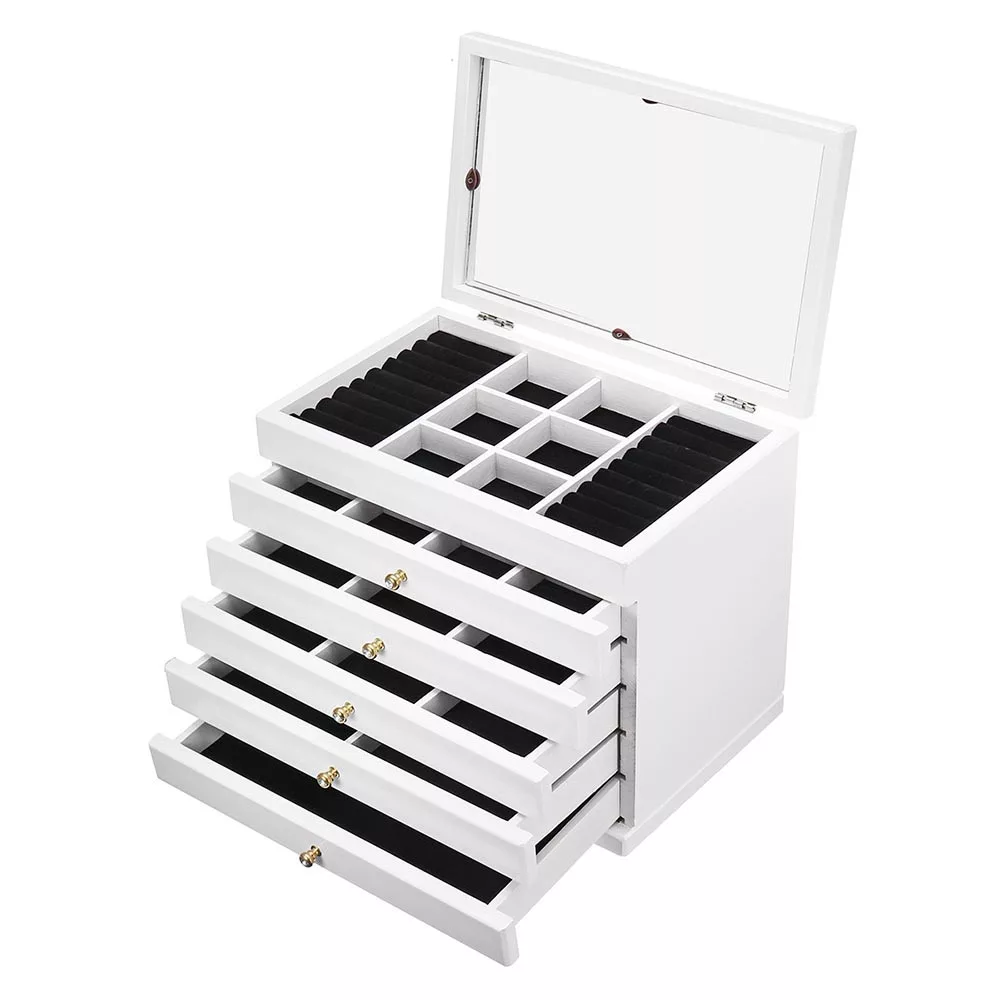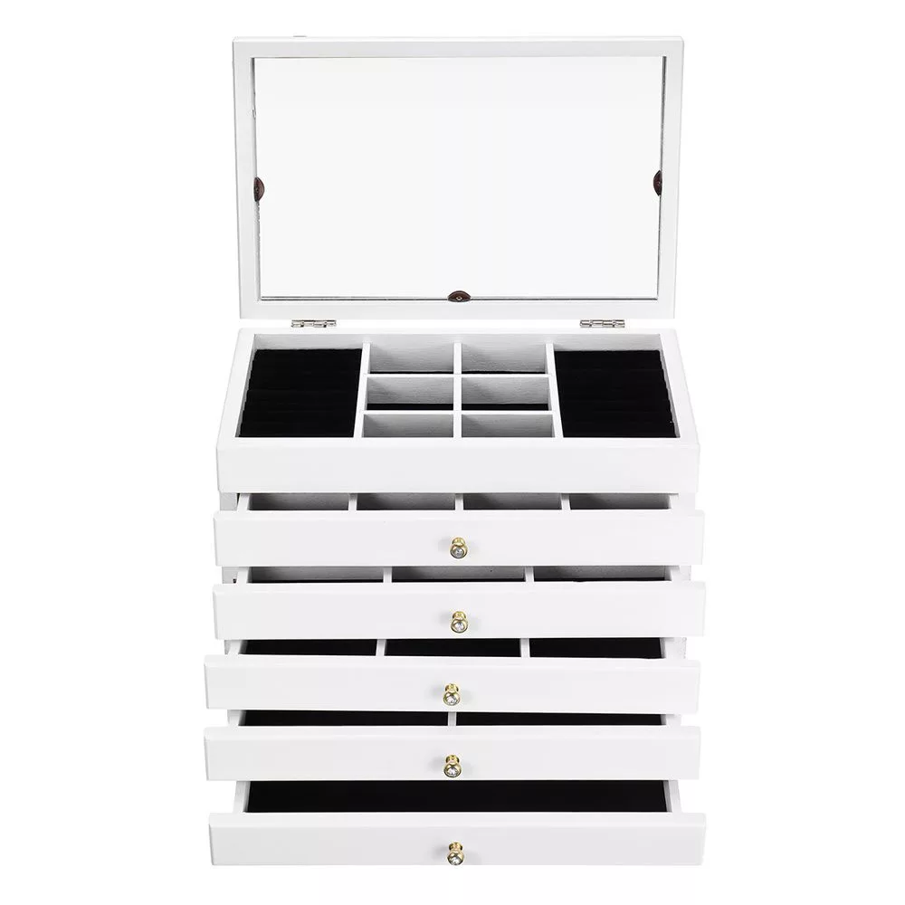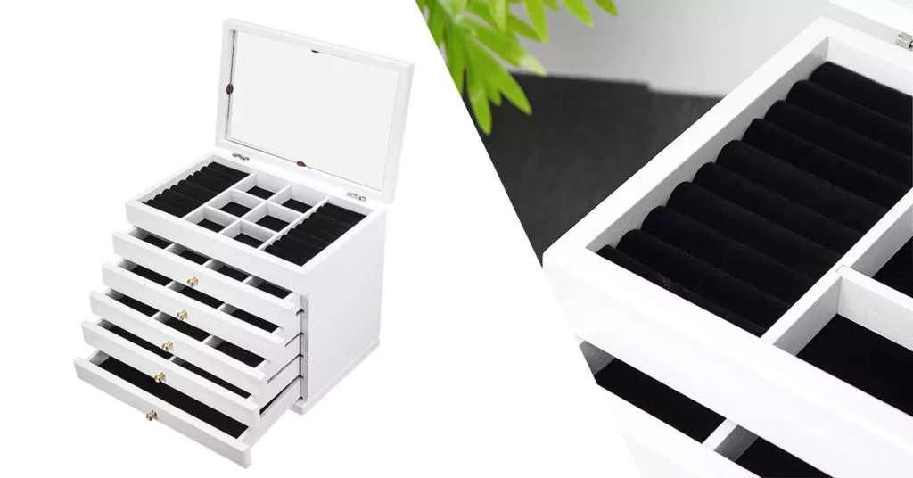 Ten 6-komorowy organizer na biżuterię to idealny wybór dla osób, które cenią sobie porządek i styl. Pięć wysuwanych szuflad oraz oddzielne przegródki zapewniają, że każda ozdoba ma swoje miejsce. Specjalne wałeczki zapobiegają rysowaniu się pierścionków, dzięki czemu nawet najcenniejsza biżuteria jest bezpieczna.
