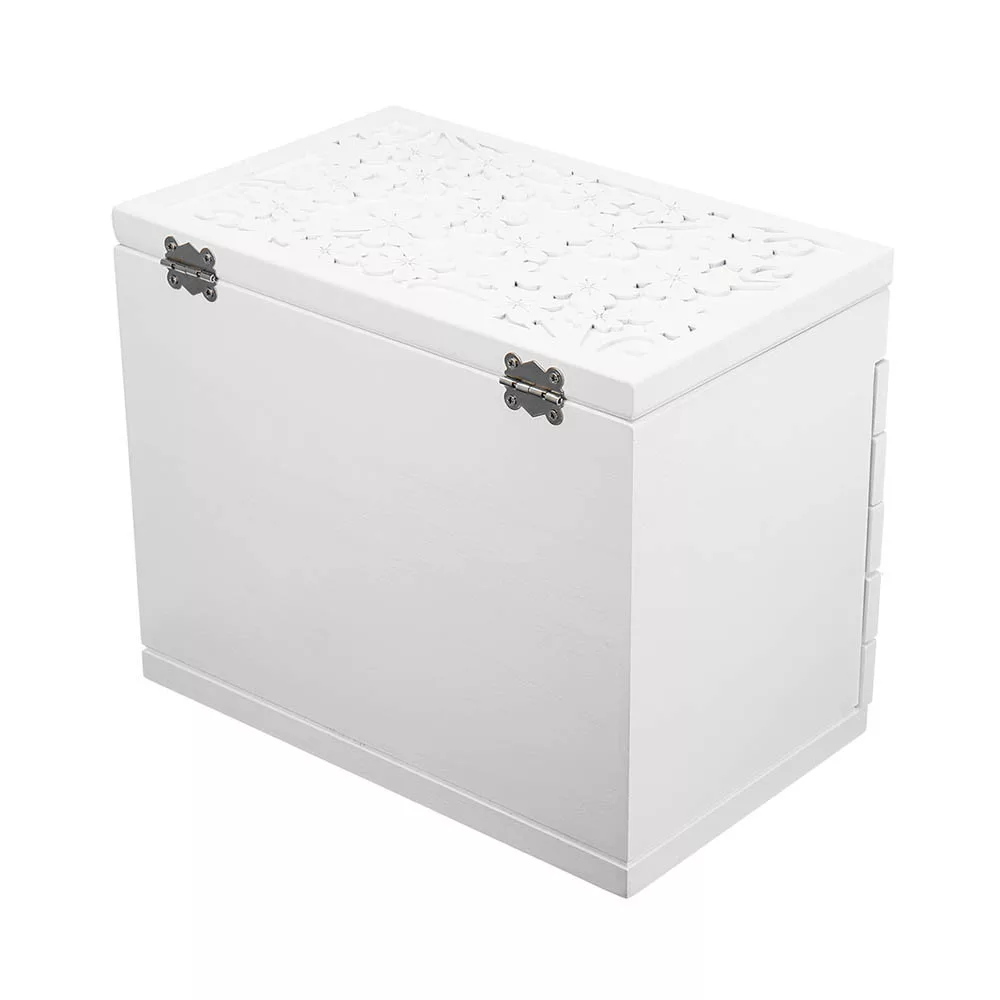 Dzięki minimalistycznej bieli i klasycznemu designowi organizer na biżuterię idealnie komponuje się z każdym wnętrzem. Umieszczony na toaletce, komodzie czy półce pełni nie tylko funkcję praktycznego schowka, ale również eleganckiej dekoracji.