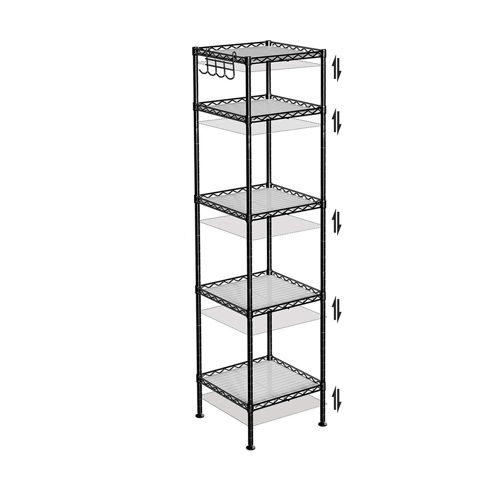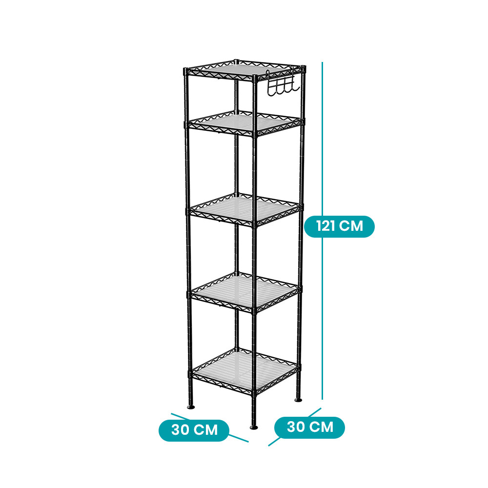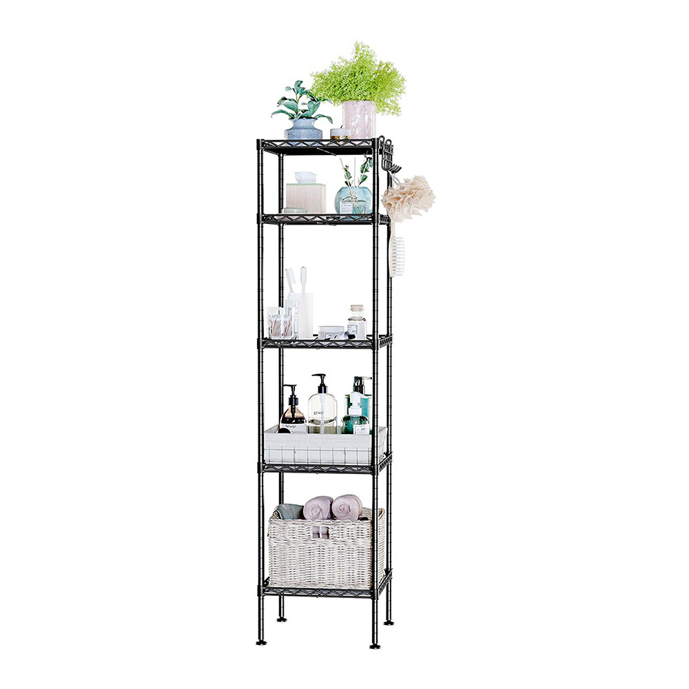 Ta metalowa półka łazienkowa z 5 poziomami to idealne rozwiązanie, gdy masz mało miejsca, ale chcesz przechowywać wszystko w porządku. Zajmuje tylko 30 × 30 cm, a zapewnia dużo miejsca na ręczniki, kosmetyki i środki czystości.