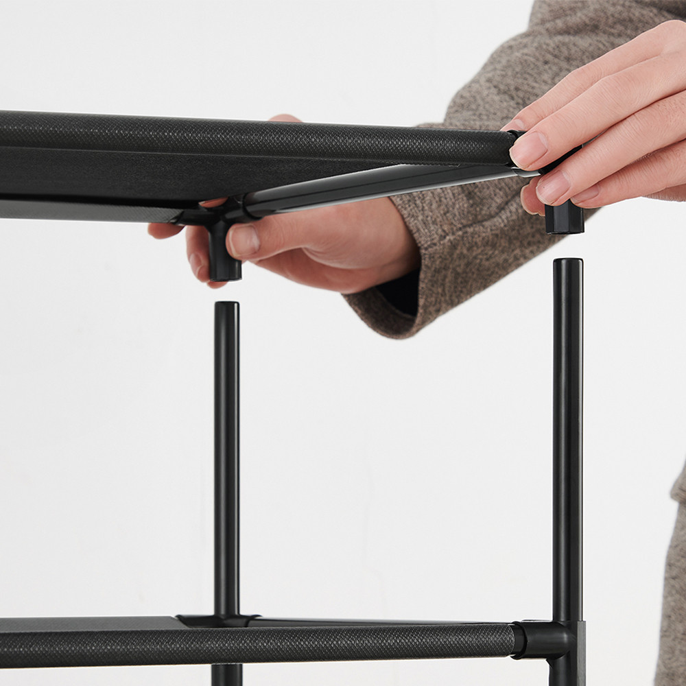 Wykonany z metalowych rurek, włókniny i wytrzymałych plastikowych złączy stojak zapewnia stabilność i długą żywotność. Każda półka może utrzymać do 5 kg.
