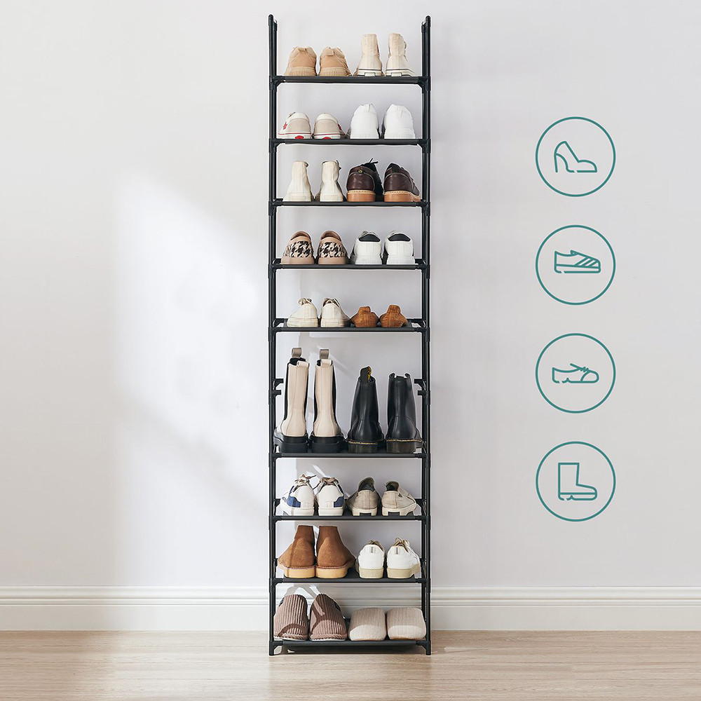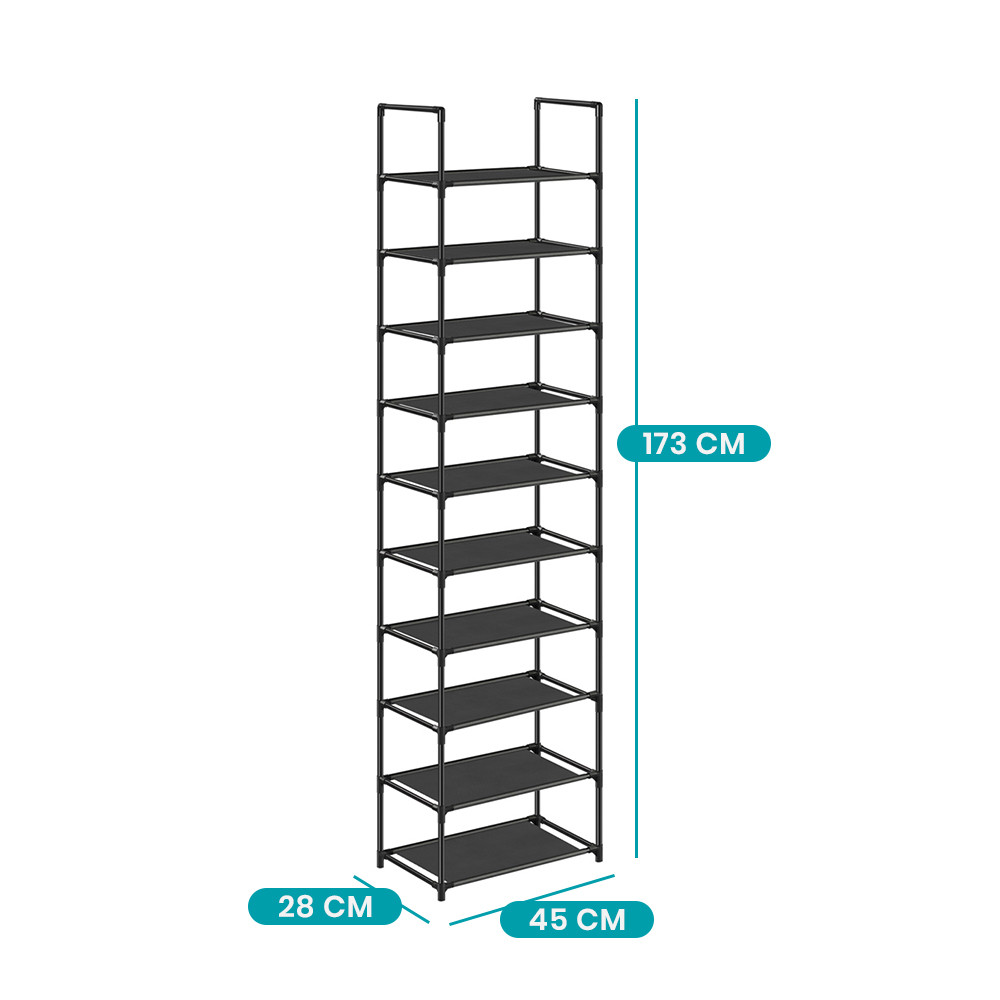 Ten 10-poziomowy stojak na buty to idealne rozwiązanie, gdy chcesz przechować wiele par obuwia na małej przestrzeni. Wysoka konstrukcja pozwala na uporządkowanie nawet 30 par butów w przejrzysty sposób.