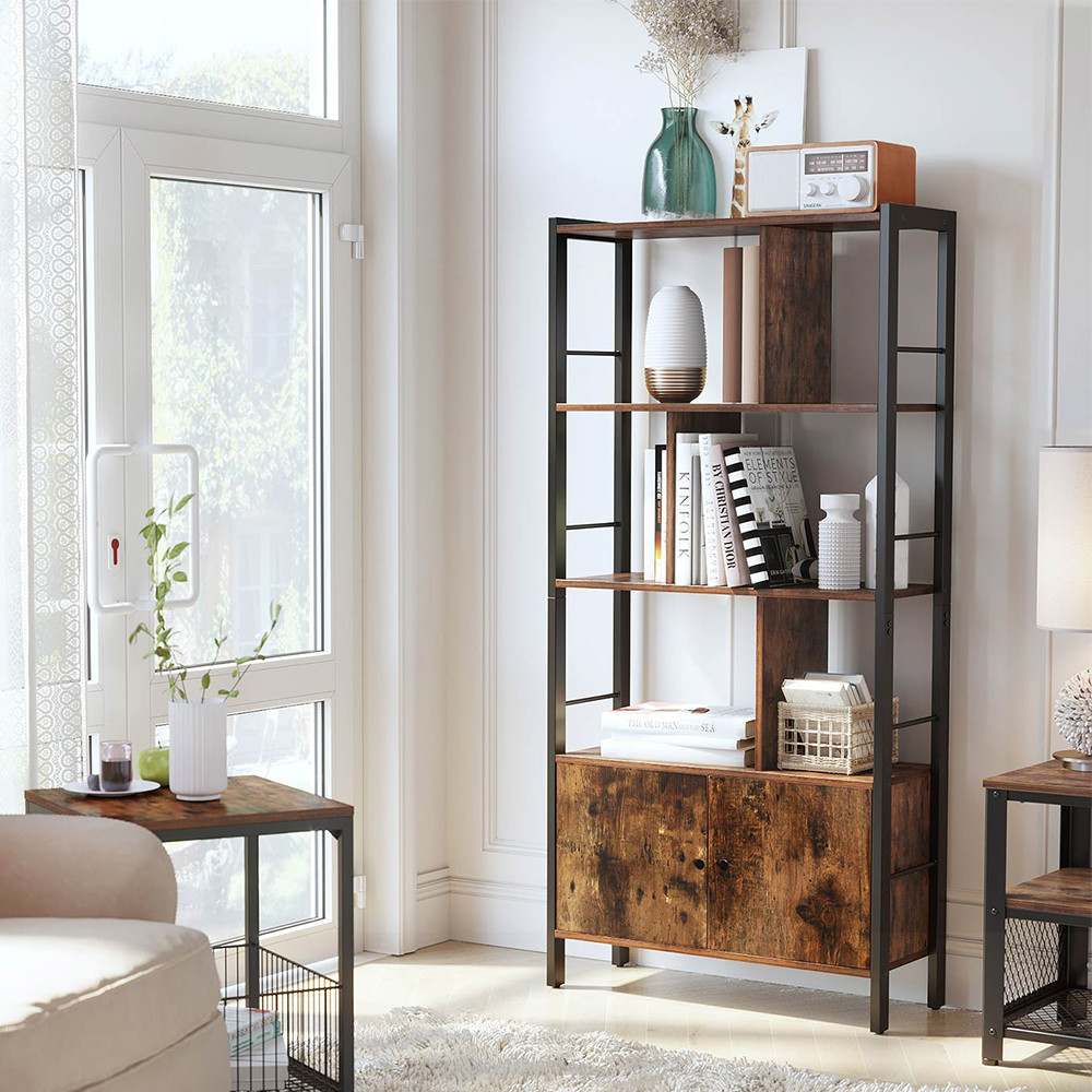 Cztery otwarte półki oferują dużo miejsca na książki, rośliny czy dekoracje, a dolna szafka z dwoma drzwiczkami pozwala ukryć mniej dekoracyjne przedmioty. Boczne listwy krzyżowe zapobiegają zsuwaniu się książek, a także mogą posłużyć do zawieszenia słuchawek lub drobnych akcesoriów.