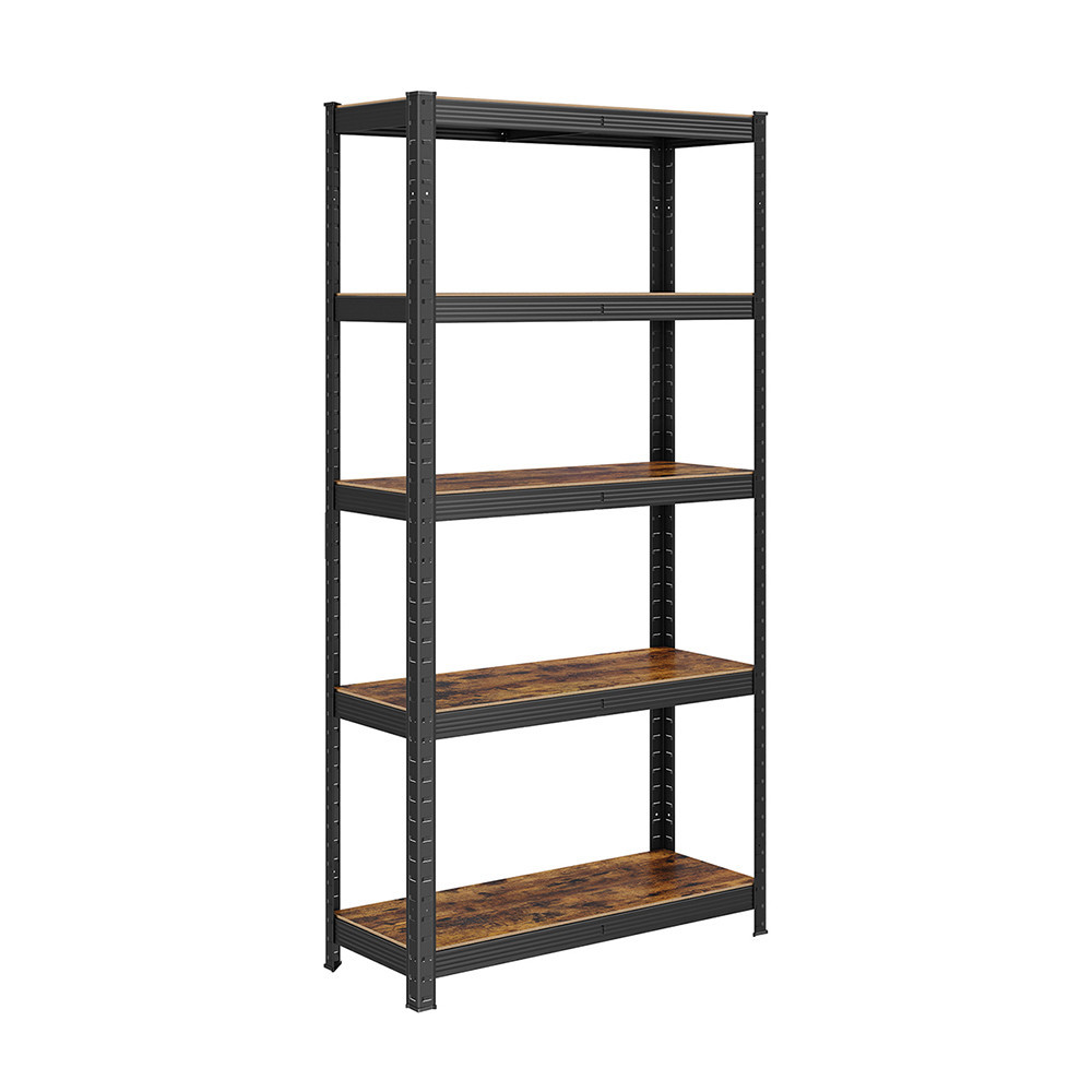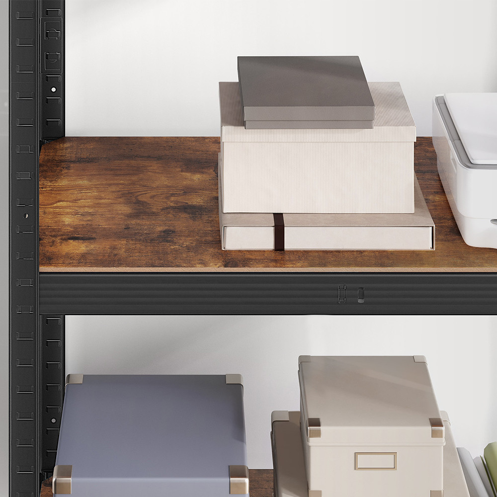 Brązowe, rustykalne półki i czarna stalowa rama nadają całości stylowy, industrialny charakter. Idealny do salonu, gabinetu, a nawet warsztatu.