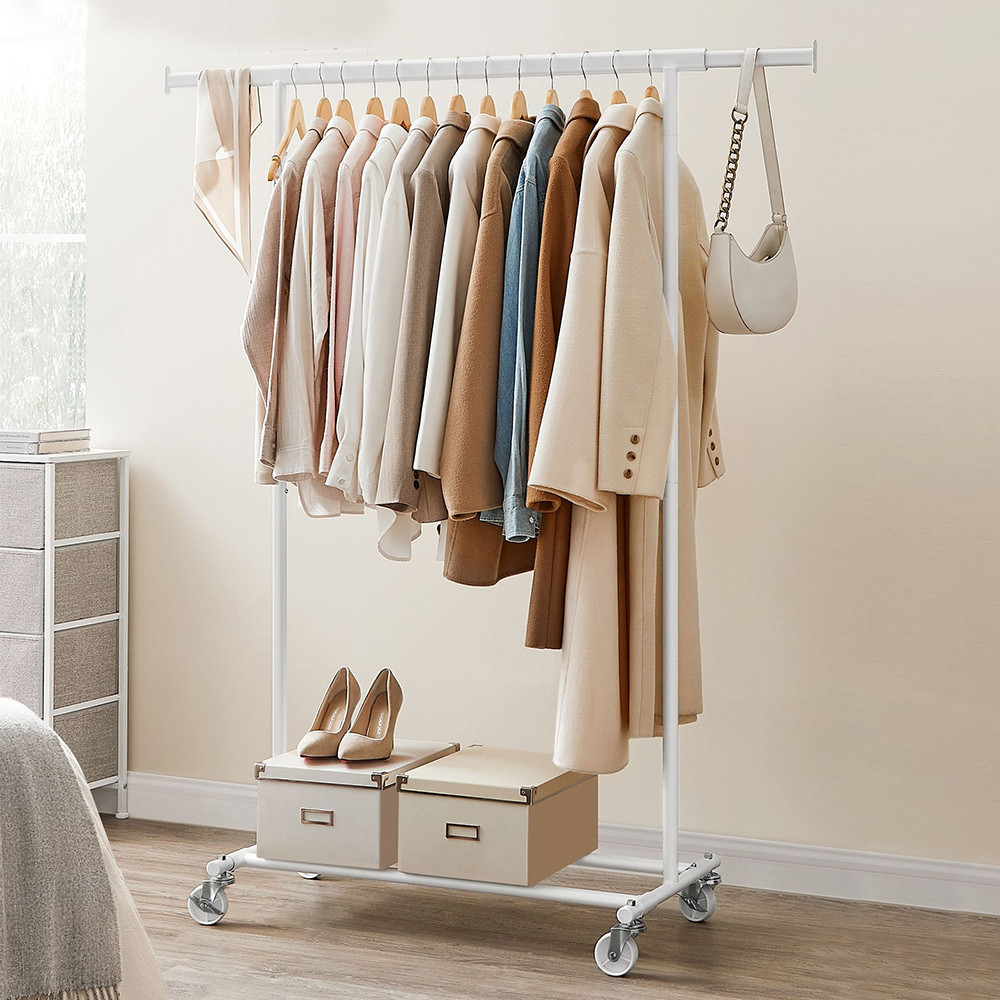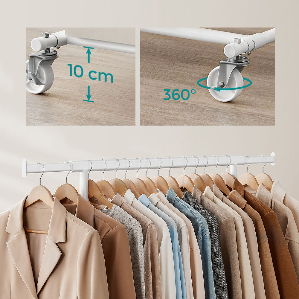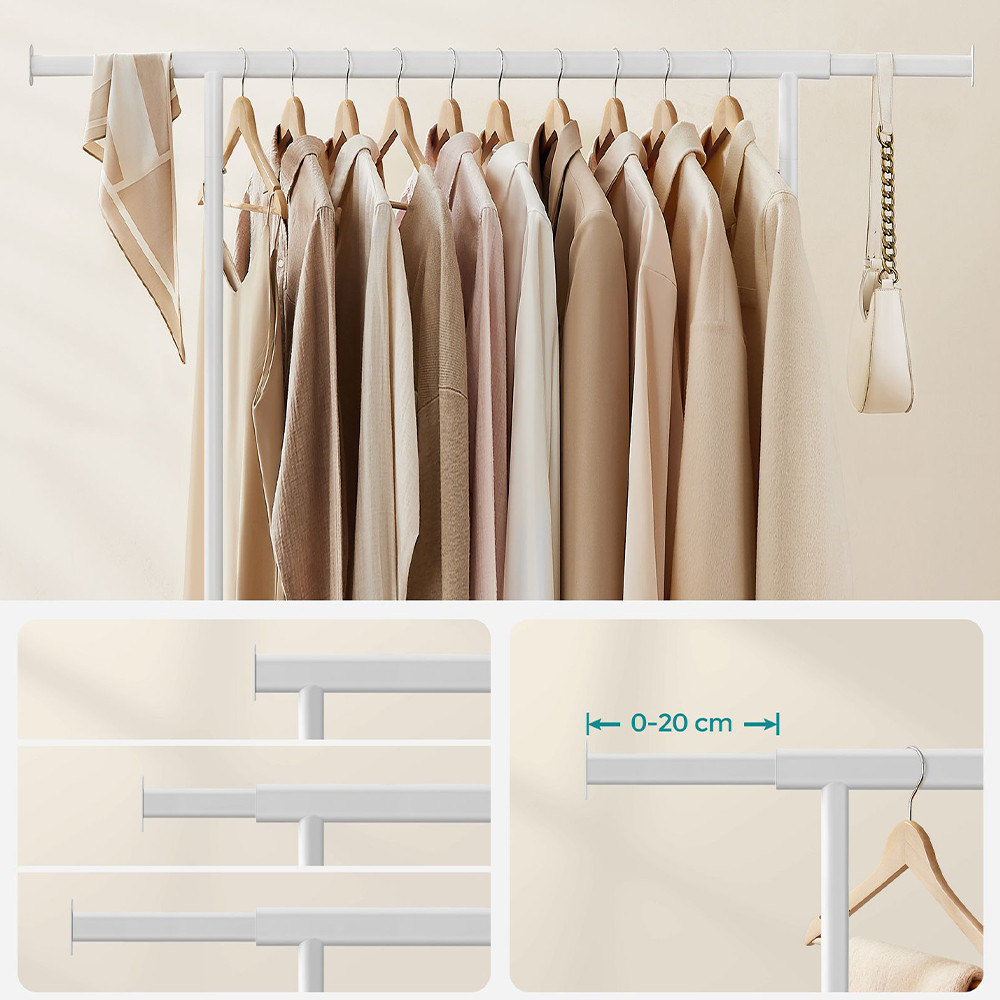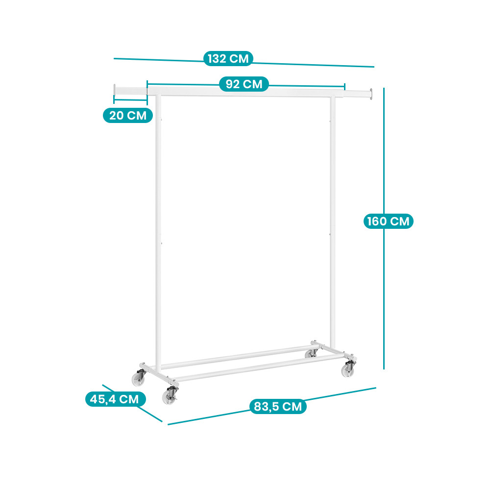 Górny drążek teleskopowy można regulować w zakresie 92–132 cm, co zapewnia wystarczająco dużo miejsca na różne rodzaje odzieży. Boczne rozszerzenia idealne są na torby, szaliki lub kapelusze.