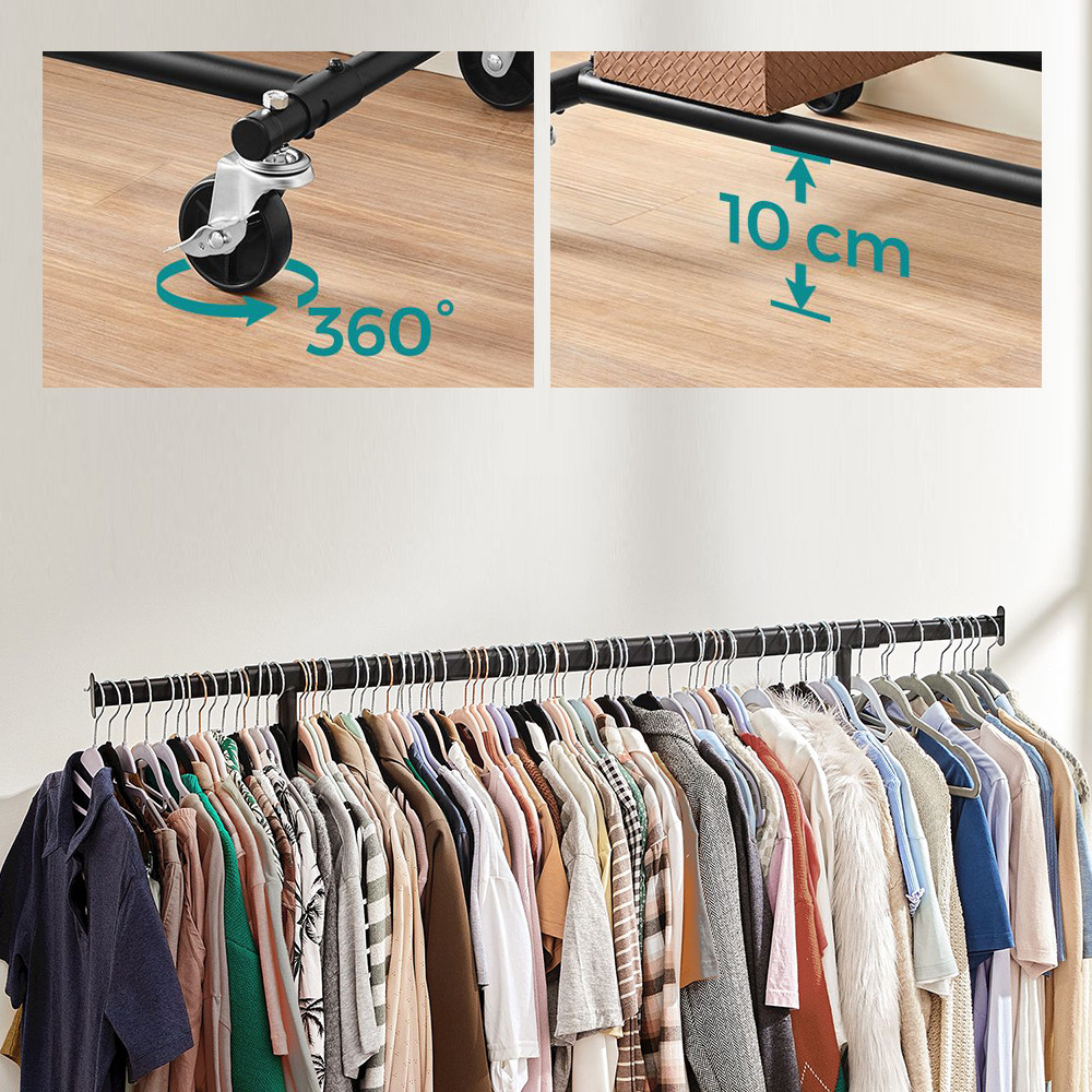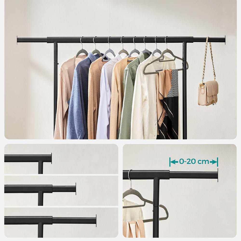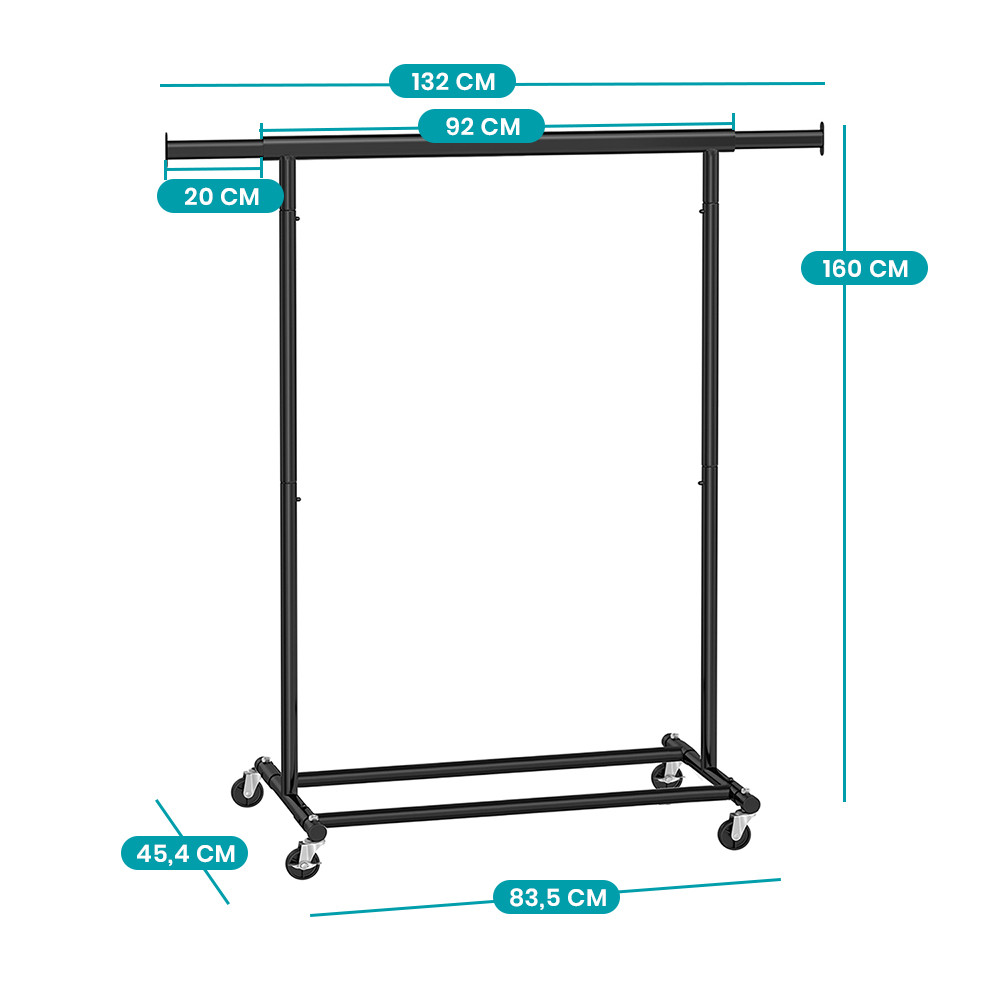 Górny drążek teleskopowy można regulować w zakresie 92–132 cm, co zapewnia wystarczająco dużo miejsca na ubrania. Boczne rozszerzenia idealne są na torby, szaliki lub kapelusze.