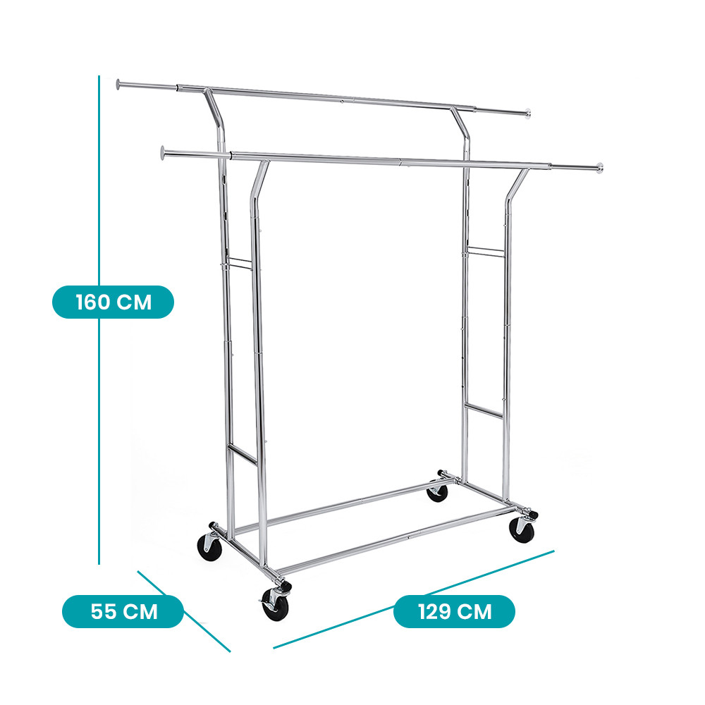 Górny drążek można rozszerzyć w zakresie 129–169 cm, a wysokość regulować od 148 do 172 cm. Idealny do wieszania różnych ubrań – od płaszczy po długie suknie.